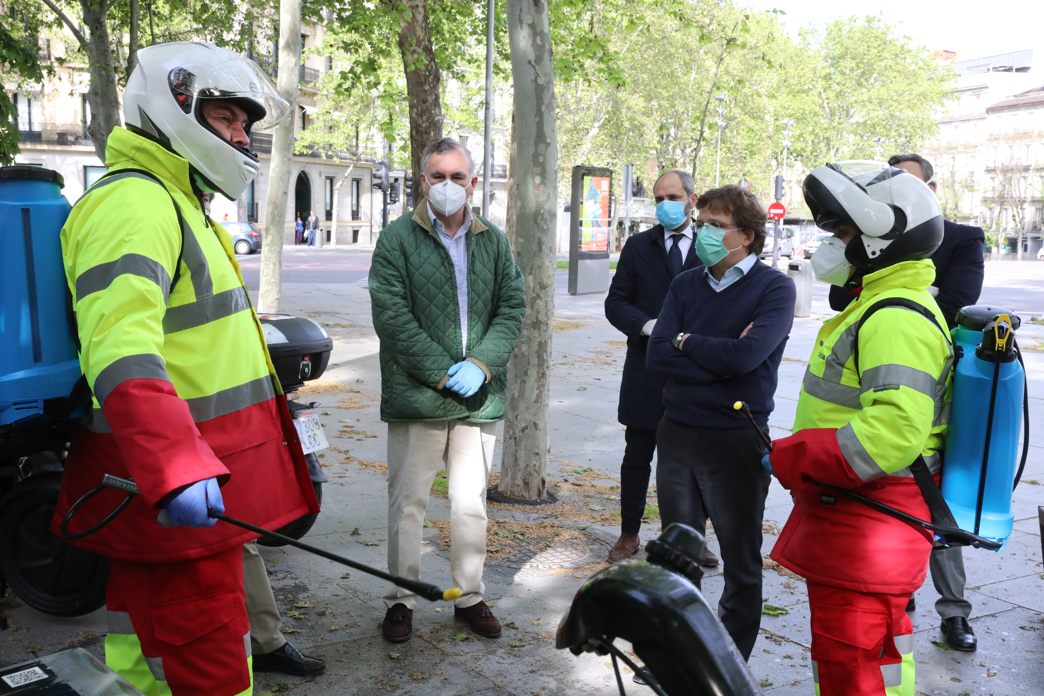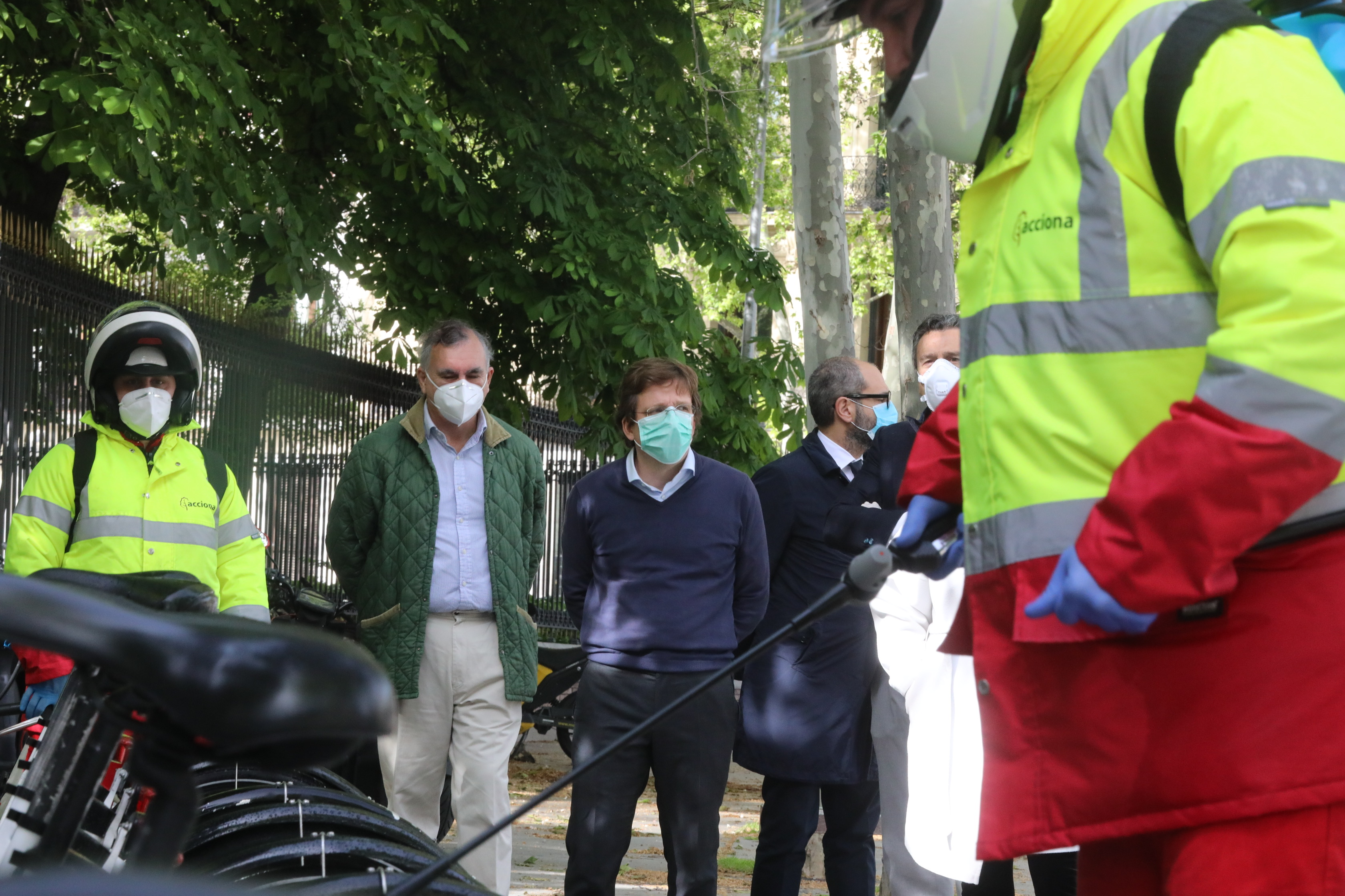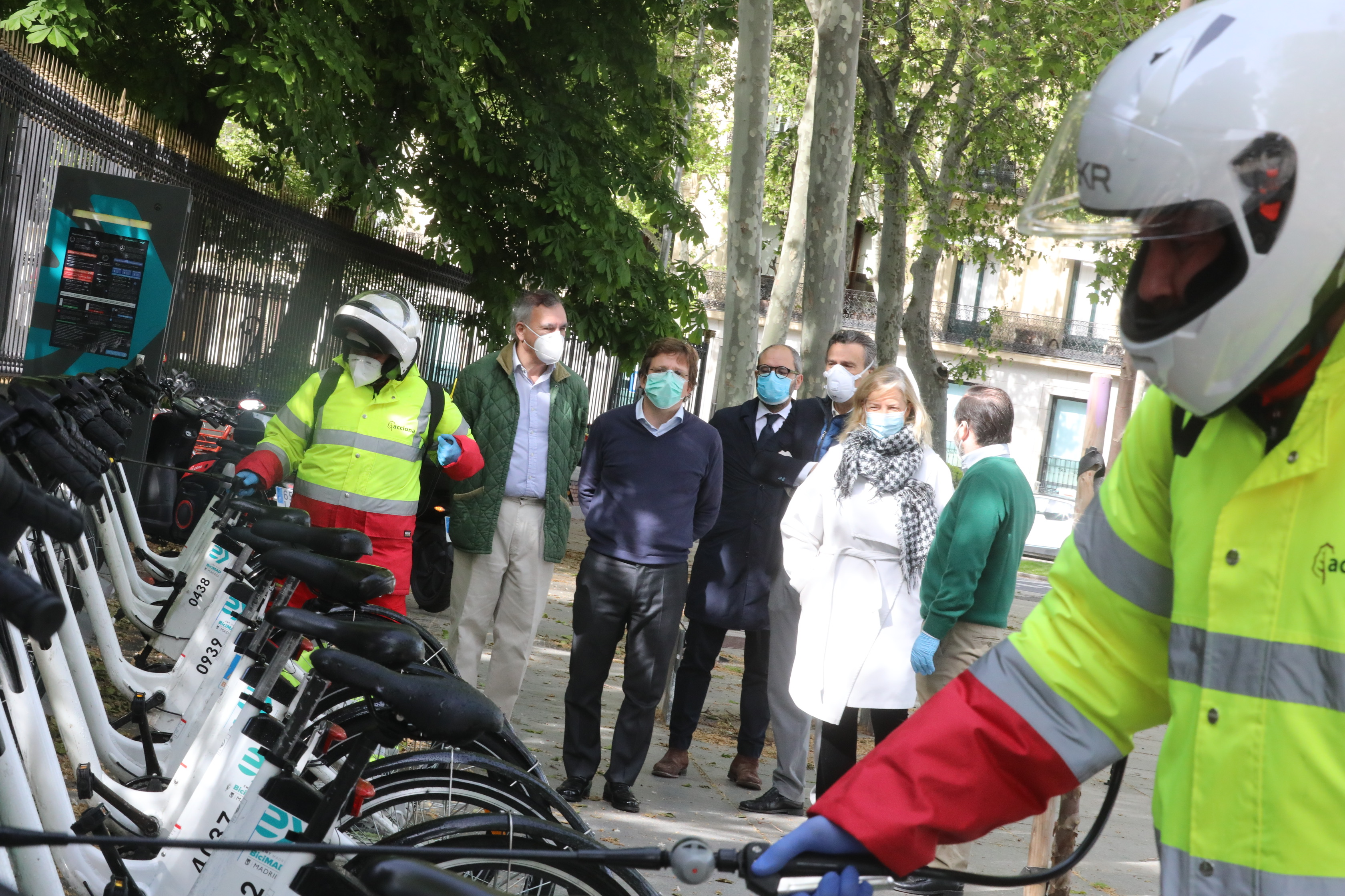 El alcalde de Madrid, José Luis Martínez-Almeida, acompañado del delegado del Área de Medio Ambiente y Movilidad, Borja Carabante, ha visitado la estación de BiciMAD de la Puerta de Alcalá para conocer de primera mano el proceso de desinfección de las estaciones y las bicicletas el día en el que el Ayuntamiento reabre este servicio.