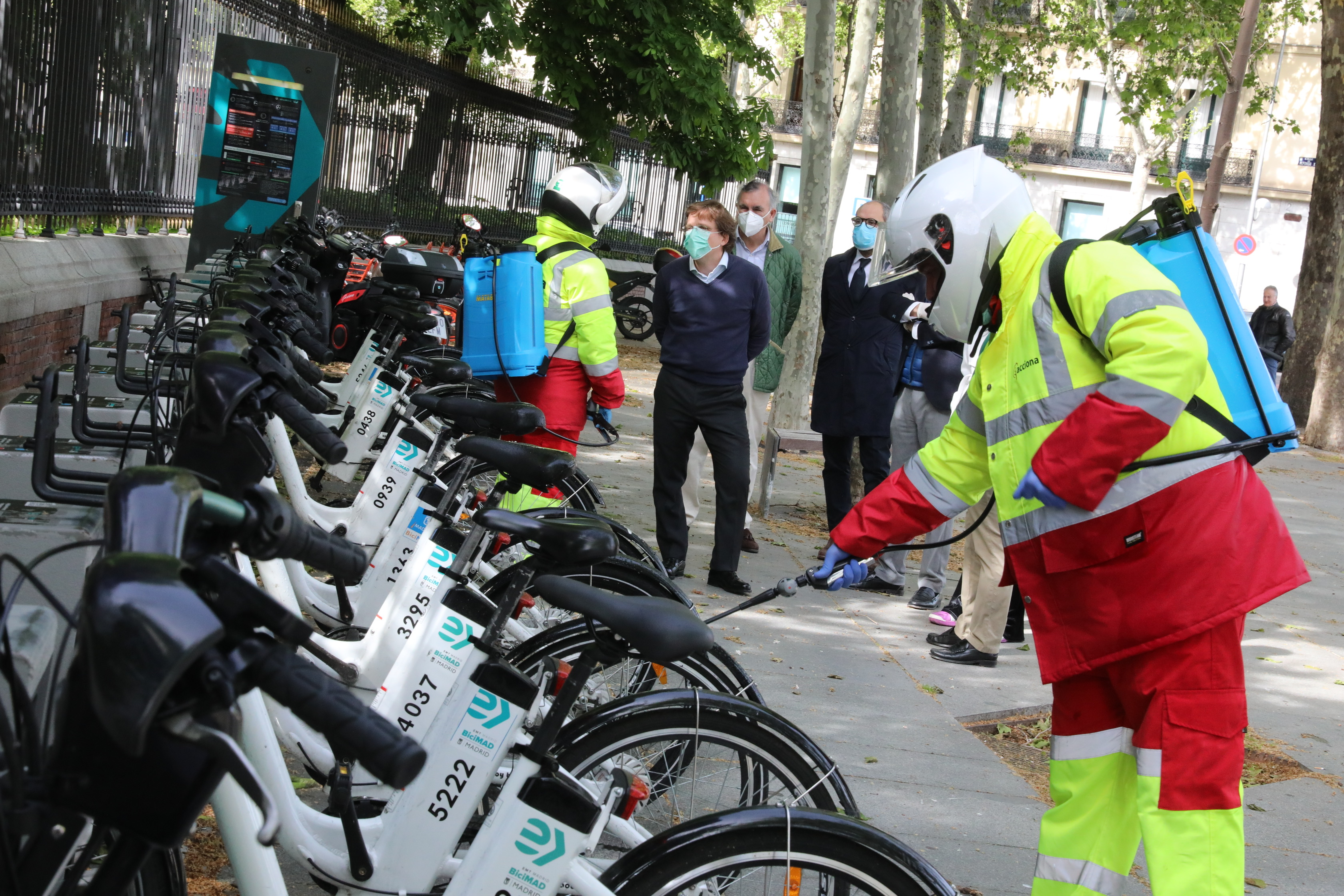 Almeida comprueba cómo se desinfecta BiciMAD en su reapertura