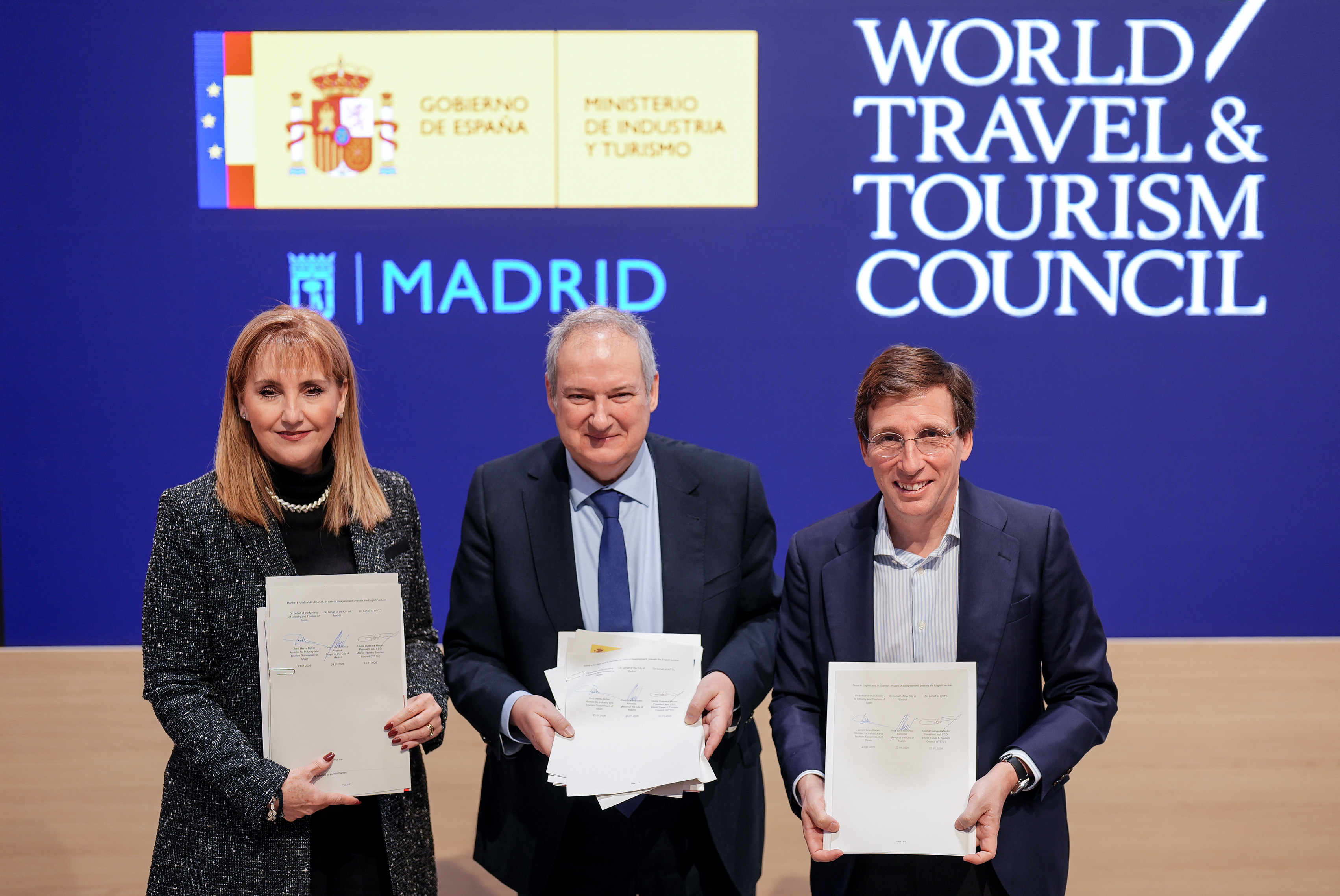 El alcalde de Madrid, José Luis Martínez-Almeida, ha firmado hoy el memorándum de entendimiento con el Consejo Mundial de Viajes y Turismo (WTTC, por sus siglas en inglés) y el Ministerio de Industria y Turismo que ratifica el traslado de la sede global de WTTC a la ciudad. Este acuerdo consolida el liderazgo internacional de Madrid en el sector turístico y refuerza su posición como capital mundial del turismo. El memorándum ha sido suscrito por el alcalde de Madrid, la presidenta y CEO de WTTC, Gloria Guevara, y el ministro de Industria y Turismo, Jordi Hereu, en el marco de la Feria Internacional de Turismo, FITUR.