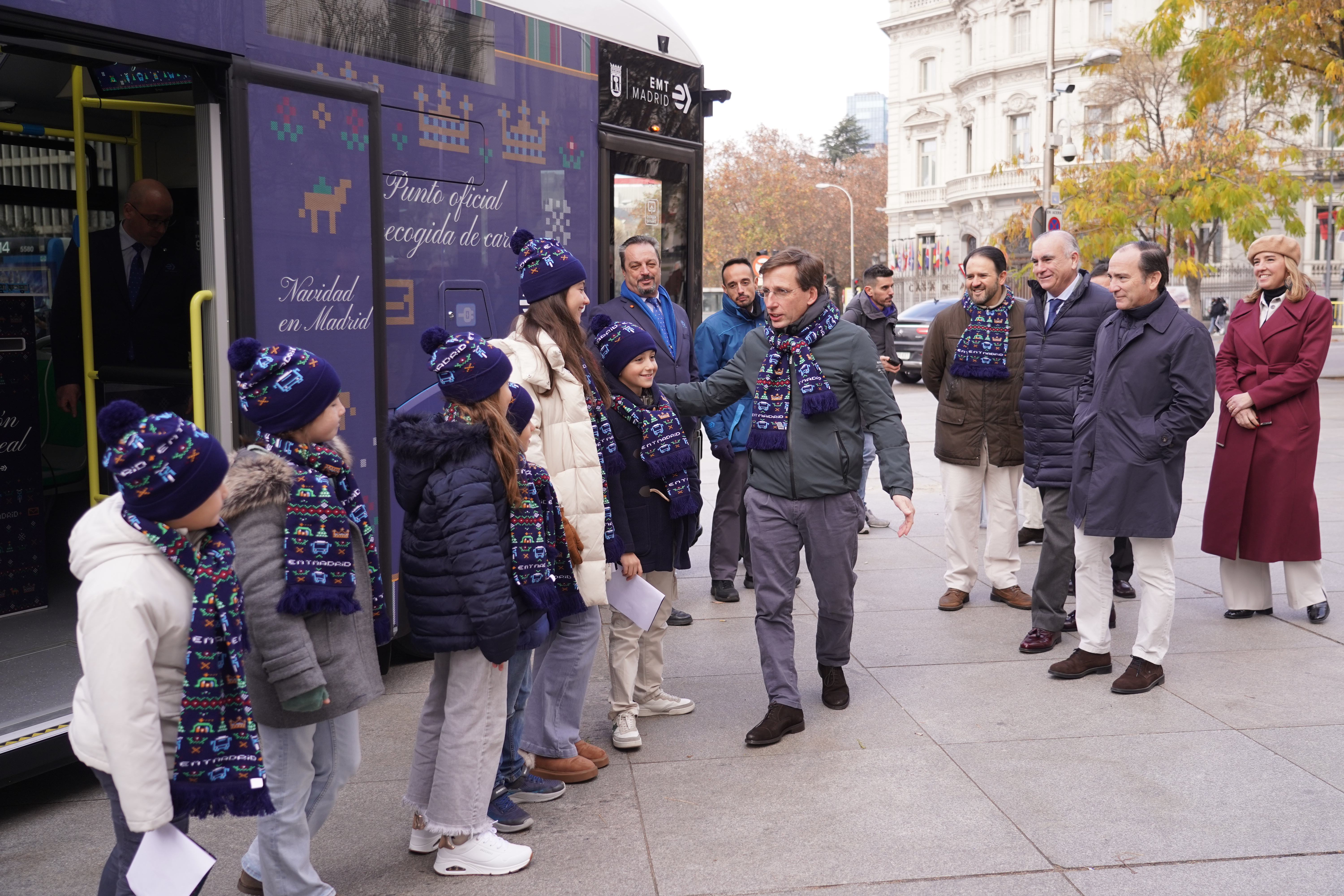 El alcalde de Madrid, José Luis Martínez-Almeida, se ha subido esta mañana al bus de la Navidad de EMT Madrid en la plaza de Cibeles, acompañado por el delegado de Urbanismo, Medio Ambiente y Movilidad, Borja Carabante. Este autobús, especialmente vinilado para la ocasión, ha vuelto a abrir sus puertas para que los niños de Madrid puedan depositar en él sus cartas llenas de deseos dirigidas a Sus Majestades los Reyes Magos. Esta acción especial navideña del Ayuntamiento y EMT Madrid permanecerá en Cibeles hasta el próximo 29 de diciembre para que los niños puedan seguir entregando sus listas de deseos.