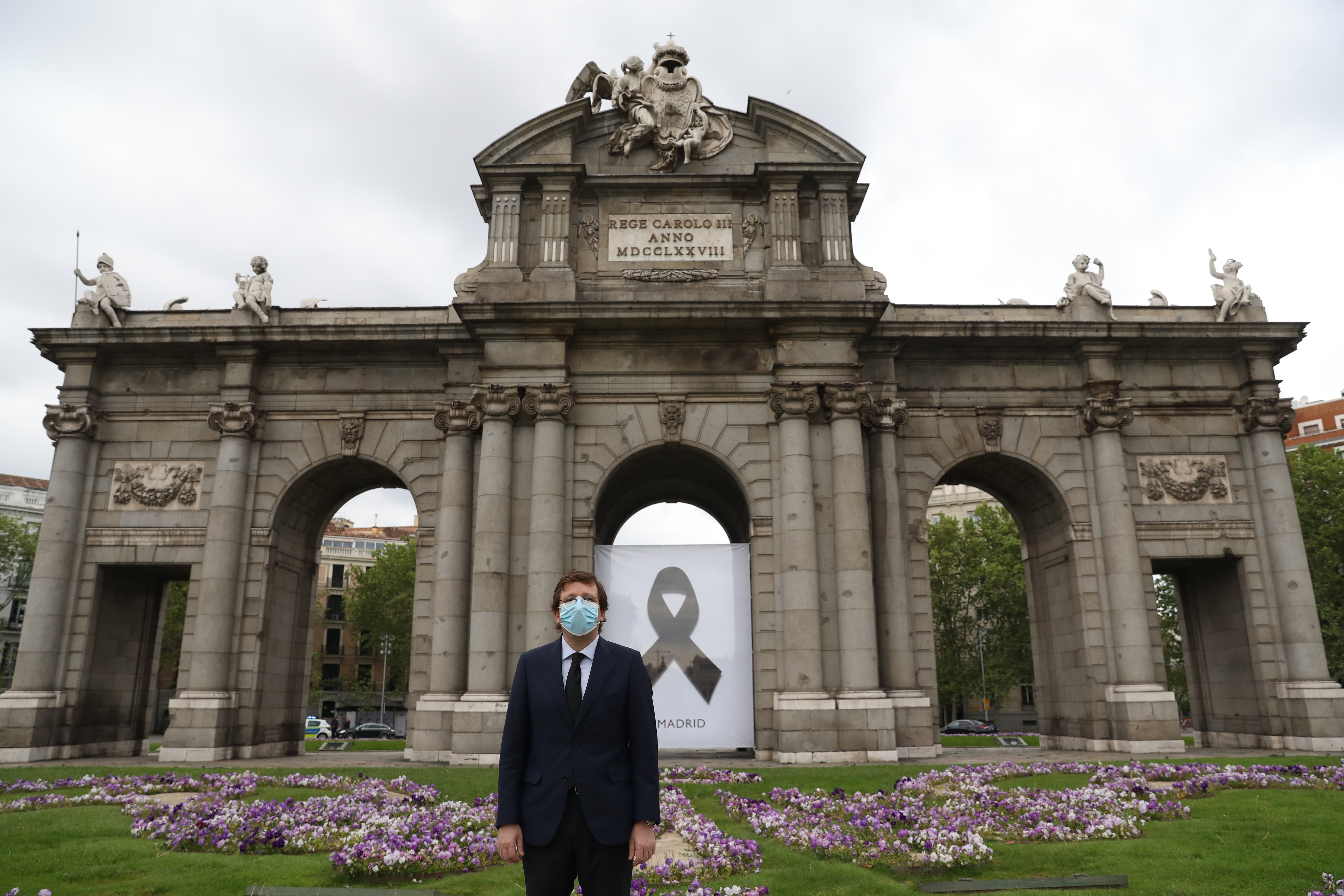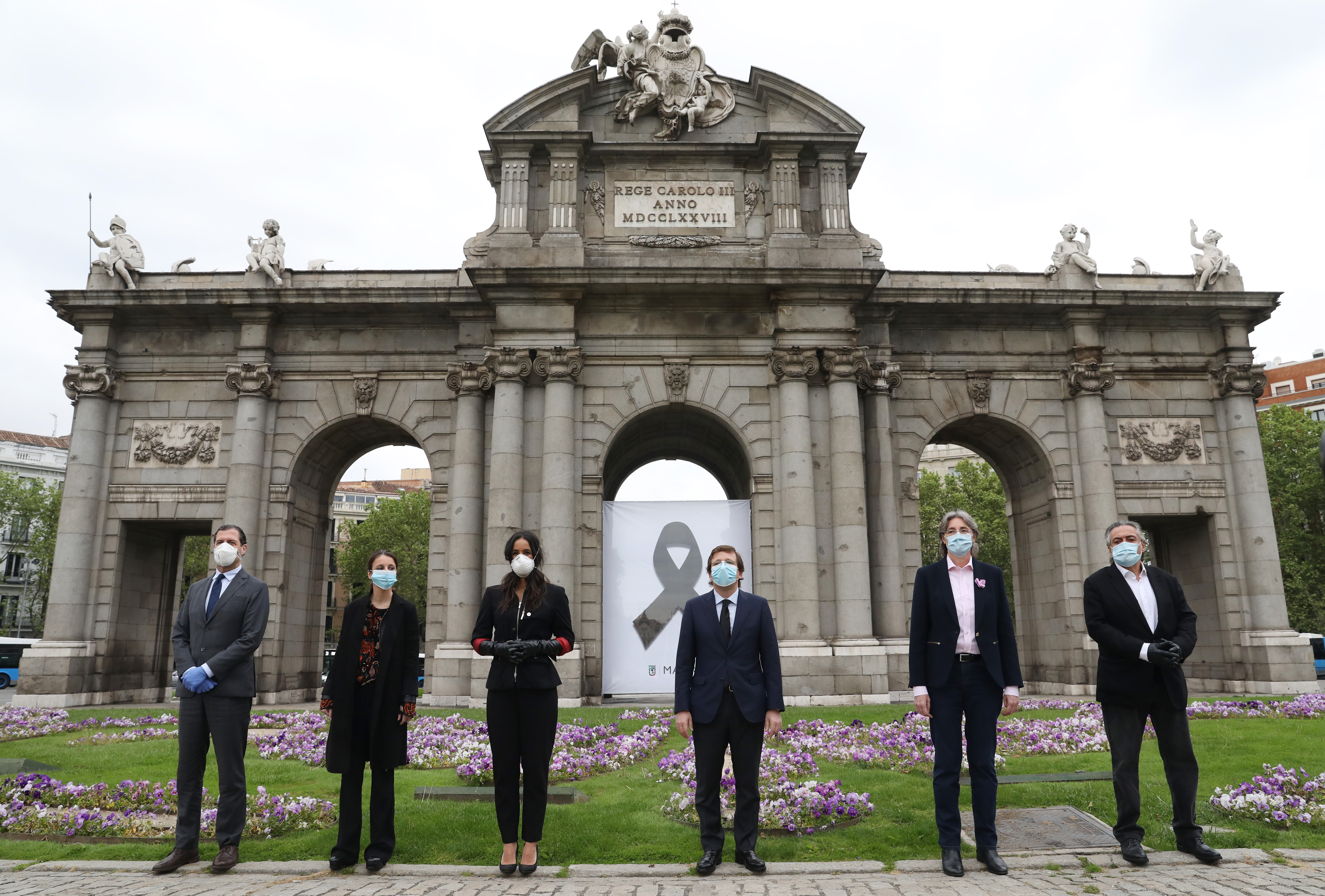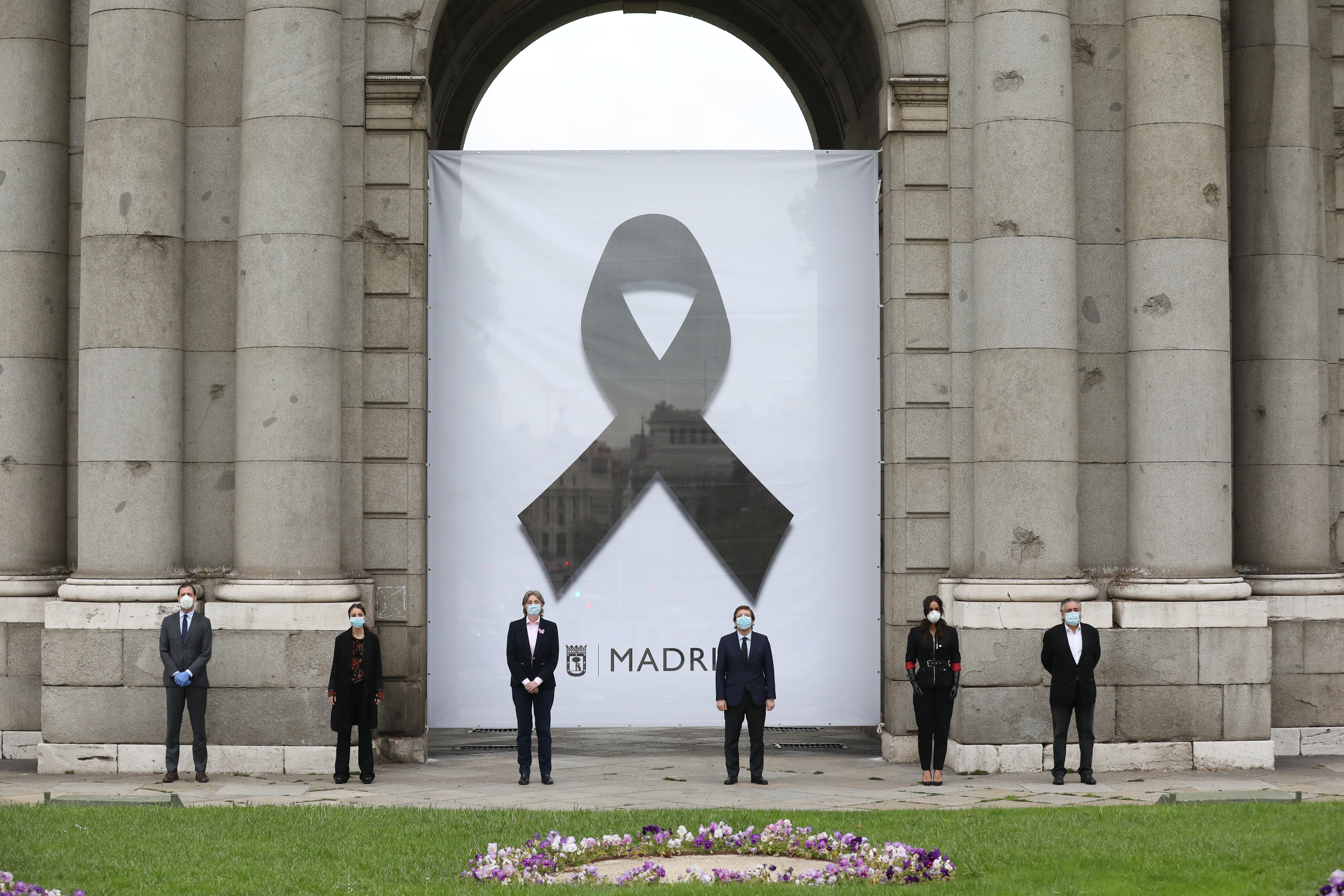 El alcalde de Madrid, José Luis Martínez-Almeida, acompañado de la vicealcaldesa, Begoña Villacís, y de los portavoces de los grupos municipales ha guardado esta mañana un minuto de silencio en la Puerta de Alcalá por los fallecidos a causa de la COVID-19. En el acto se ha descubierto un crespón negro que el Ayuntamiento de Madrid ha instalado en el monumento como homenaje a todas las víctimas de la pandemia.