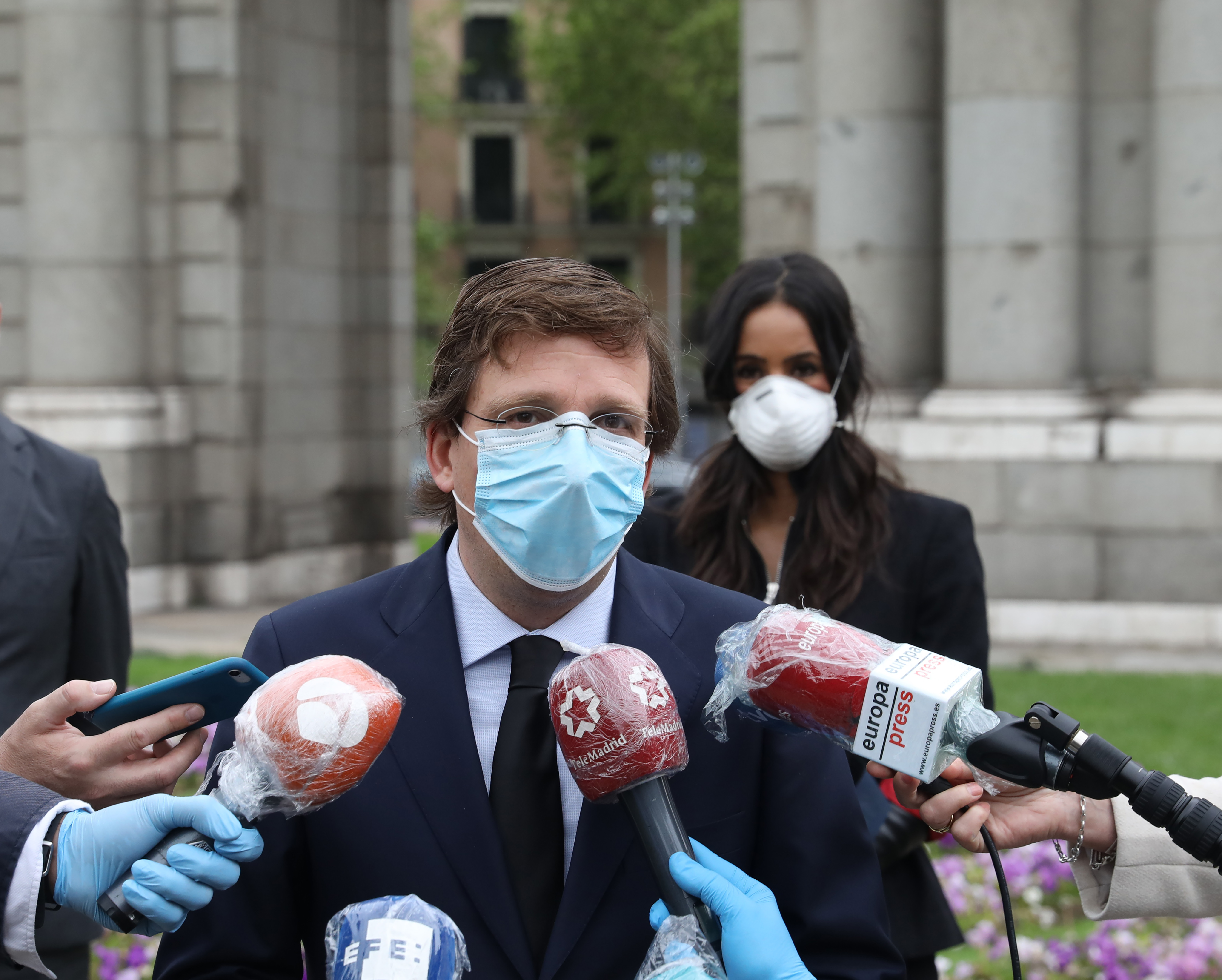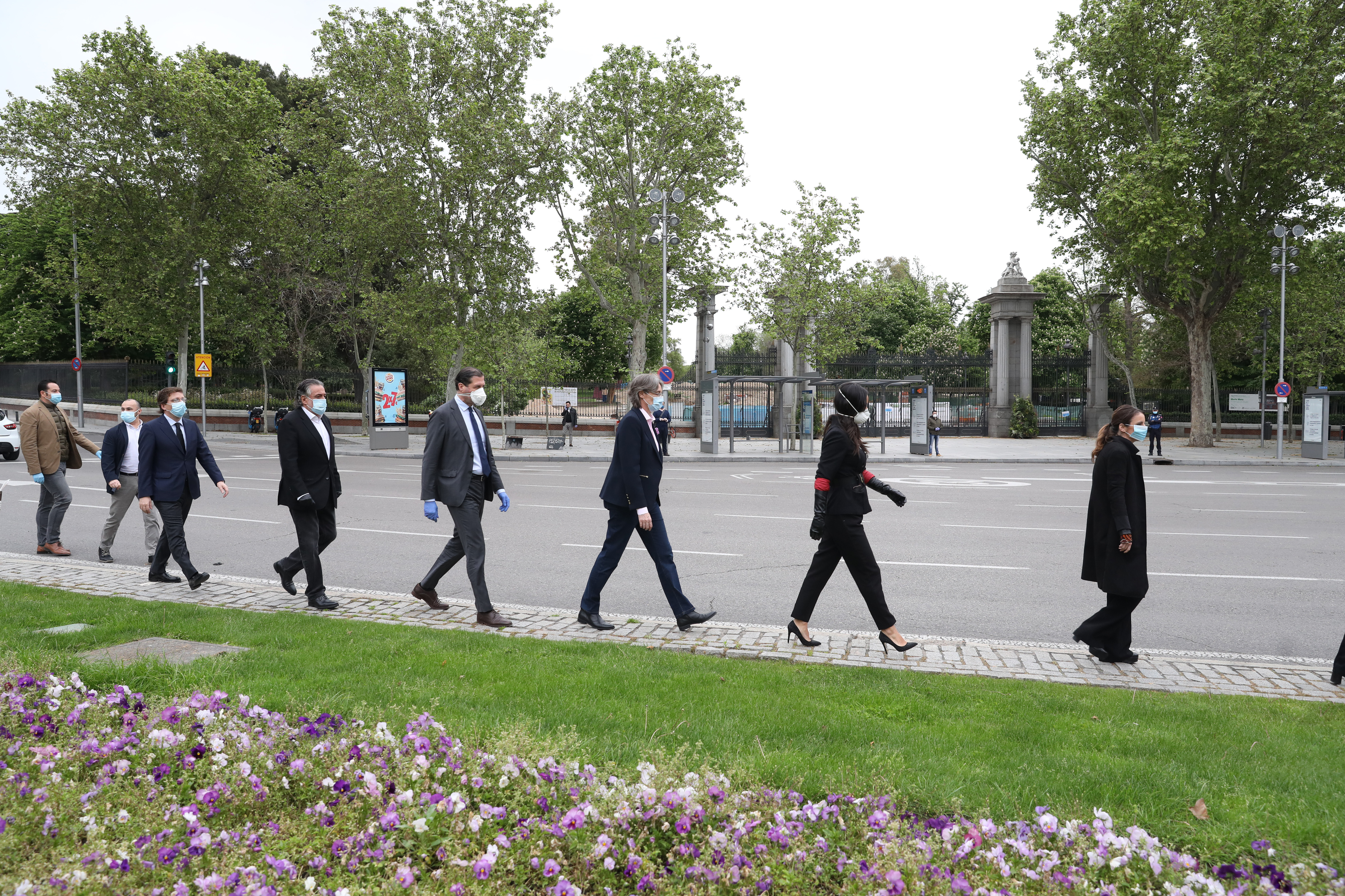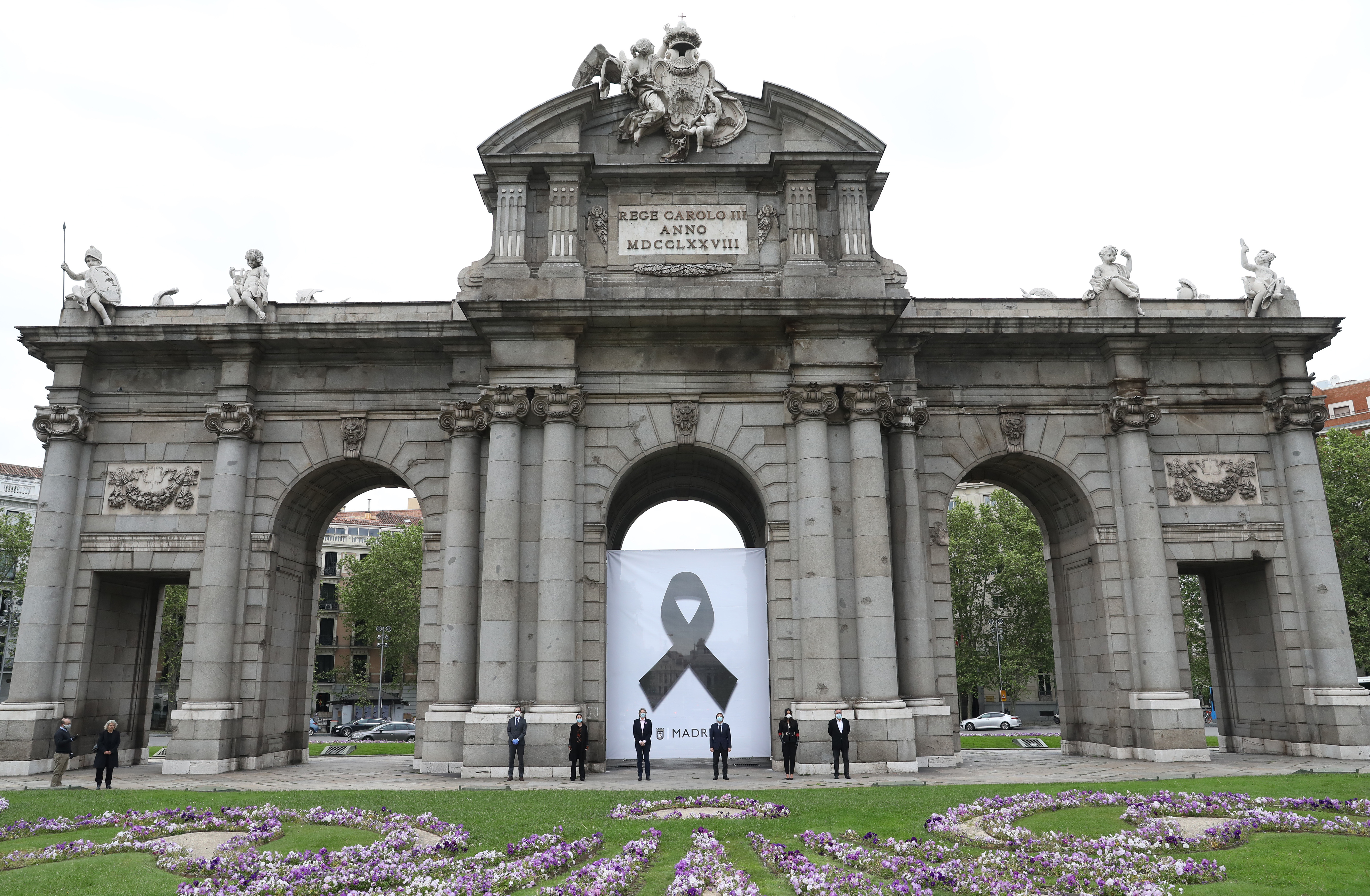 El alcalde de Madrid, José Luis Martínez-Almeida, acompañado de la vicealcaldesa, Begoña Villacís, y de los portavoces de los grupos municipales ha guardado esta mañana un minuto de silencio en la Puerta de Alcalá por los fallecidos a causa de la COVID-19. En el acto se ha descubierto un crespón negro que el Ayuntamiento de Madrid ha instalado en el monumento como homenaje a todas las víctimas de la pandemia.