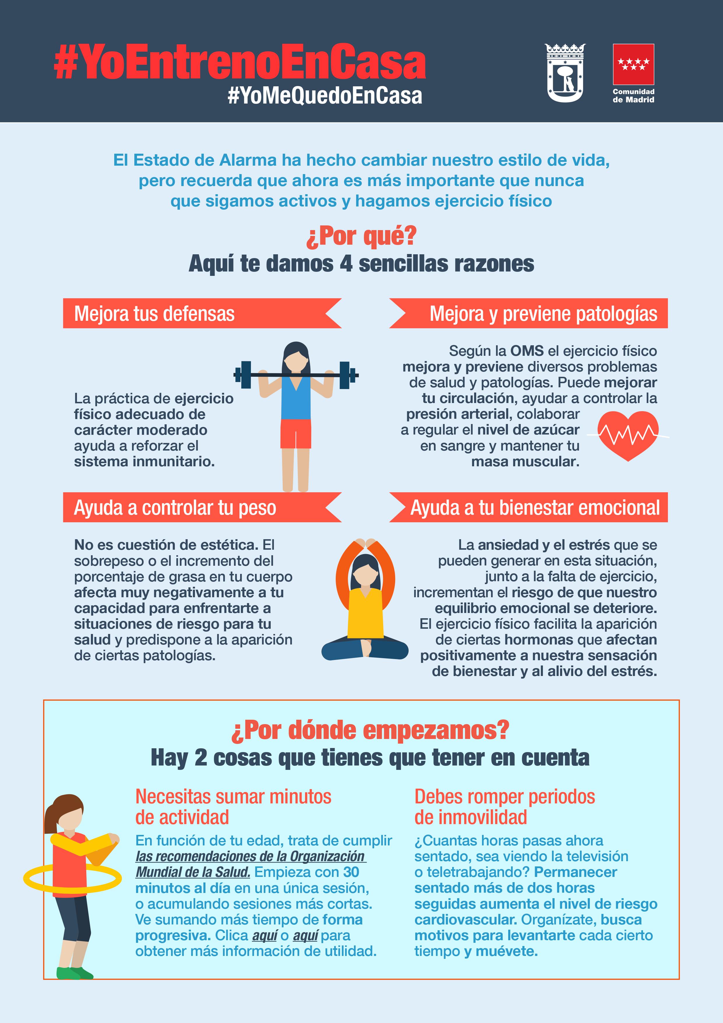 Ambas instituciones lanzan una serie de recomendaciones sobre hábitos de vida y consejos prácticos para evitar los posibles perjuicios de un excesivo sedentarismo provocado por pasar tantos días en casa. Por ello, instan a la población madrileña a mantenerse activa y a aumentar el tiempo de práctica de ejercicio físico mientras dure esta situación.