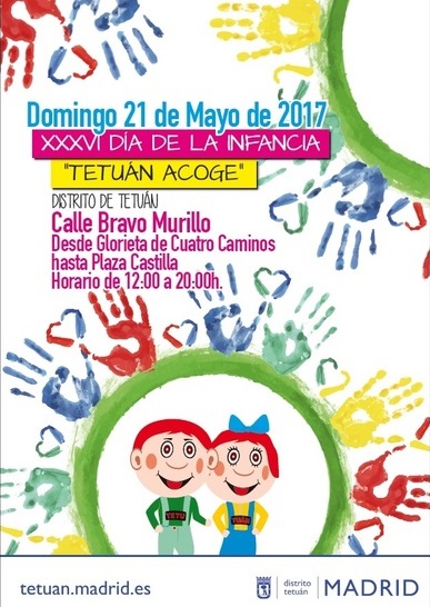 La jornada festiva dedicada al público más joven, que este año alcanza su XXXVI edición, desarrolla este año un completo programa de actividades con el eje “Tetuán acoge” haciendo girar en torno a esta temática los talleres, los pasacalles y las actuaciones que se realizarán en los 3 escenarios culturales y en 7 áreas, buscando una edición muy participativa. Además se repartirán más de 3.000 meriendas destinadas a los niños y niñas a partir de las 17.00h en los puntos de información.