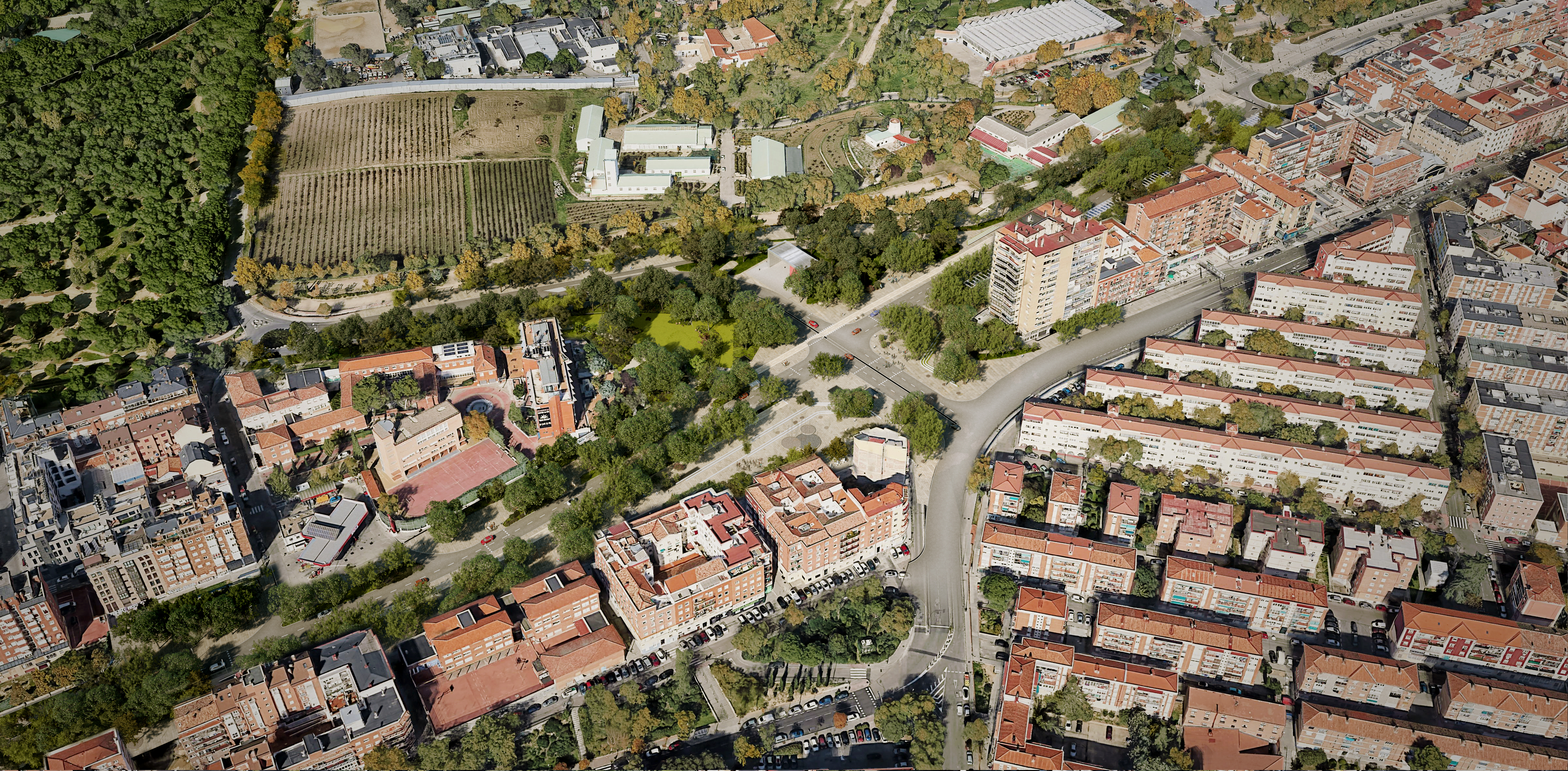 - Enlace del Parque de Atracciones. Con la reforma, quedarán resueltos los fuertes desniveles existentes en un espacio tan concentrado e invitará a la conexión peatonal desde el sur con la Casa de Campo. Integra en la trama urbana el Paseo Verde con el paseo de Extremadura, el viario sobre el túnel de la avenida de Portugal y el acceso sur hacia la Casa de Campo. La mejora del entorno para los vecinos ubicados en el sur de la A-5 será muy trascendente a nivel visual, sonoro y de regeneración del espacio urbano. Se extienden las zonas verdes, generando una lectura continua entre el Paseo Verde y la Casa de Campo en la parte norte de la intervención. Al sur, se define la primera gran plaza, marcada por su proximidad e interacción de usos con el Colegio Divino Maestro y las fachadas comerciales. Tendrá como elemento identitario una gran fuente seca (como la playa de Madrid Río) que garantizará el confort térmico en verano y tendrá también un uso lúdico, lo que reforzará la integración de este espacio público con los equipamientos del entorno.