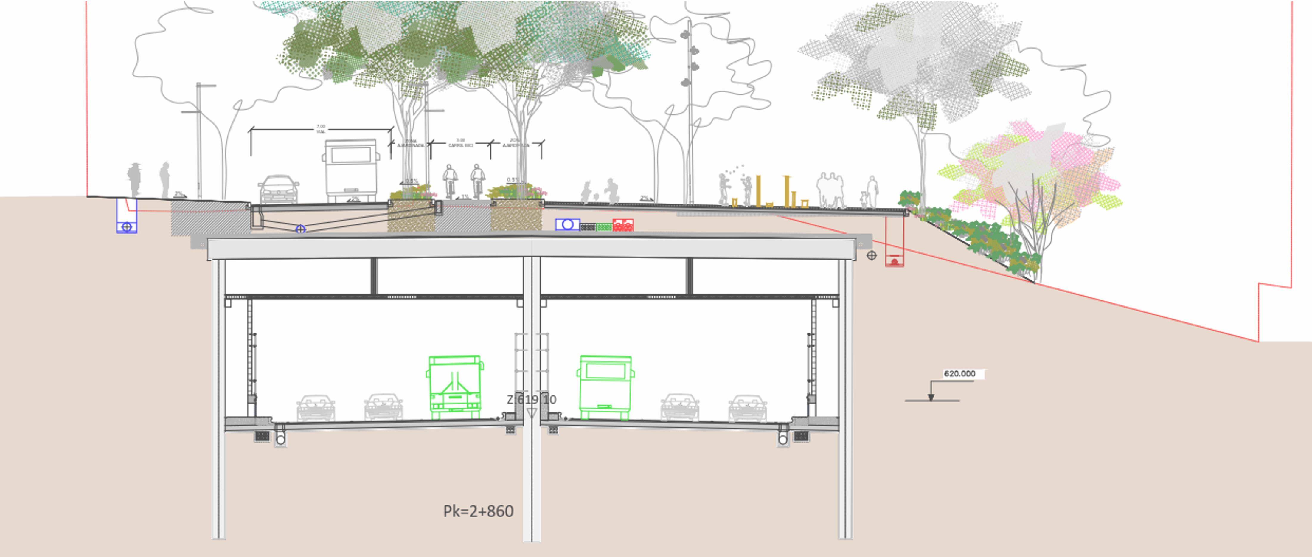 En superficie, se prioriza la movilidad peatonal y ciclista, dejando una vialidad dimensionada para atender los recorridos locales del vehículo privado y el transporte público urbano. Todo ello permitirá dotar a la zona de una enorme permeabilidad para el peatón entre ambos márgenes de la autovía actual y la conexión entre Casa de Campo, cuña verde de Latina y el entorno de Puerta del Angel y Madrid Río, generando siete nodos condensadores de actividad a lo largo de todo el trazado.