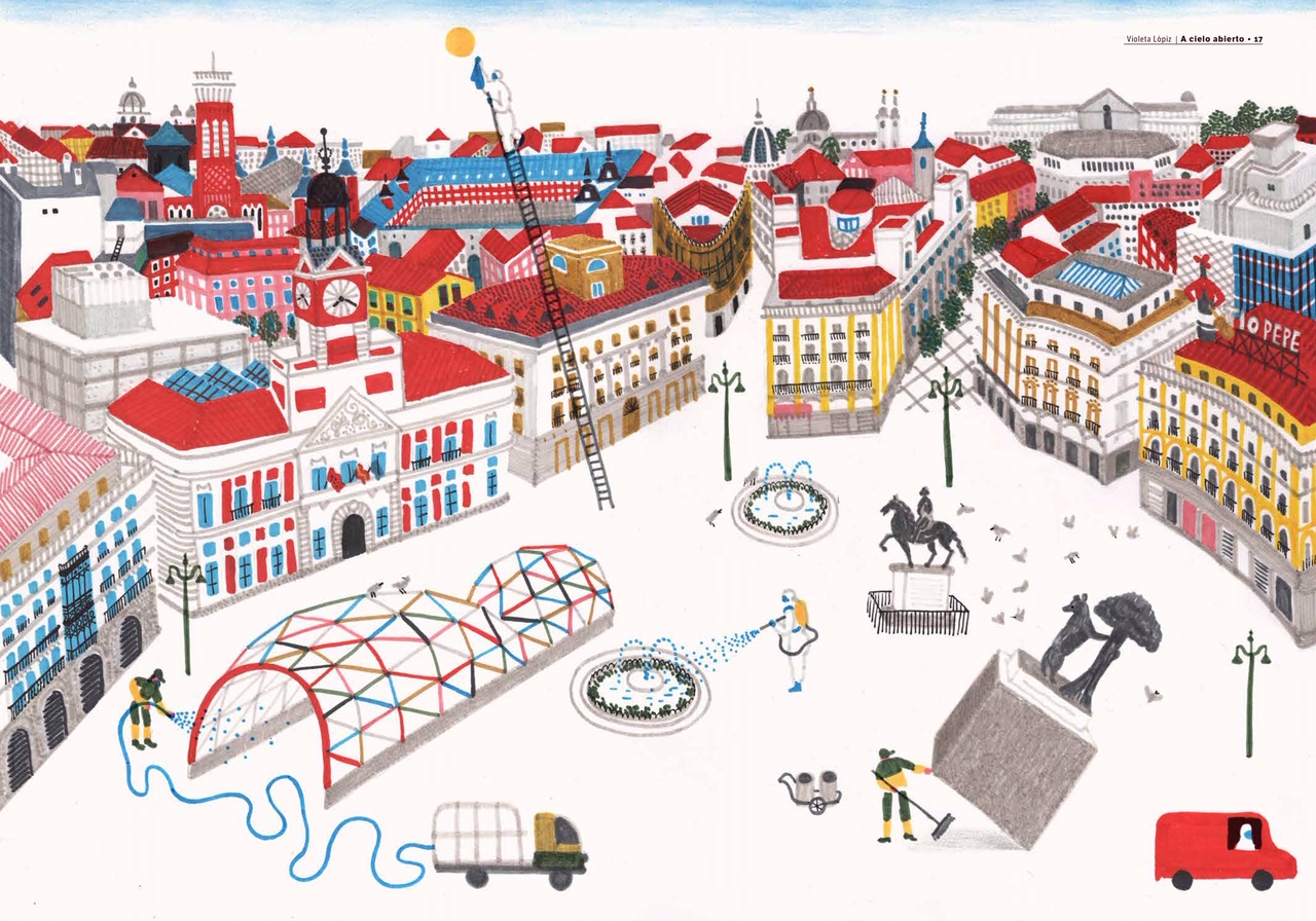 En el homenaje ilustrado a todos los héroes sin capa, Sr. García recuerda a ‘todos y cada uno de vosotros que habéis sido esenciales’; Luis F. Sanz representa a los cuerpos de seguridad y emergencia combatiendo contra el virus como un monstruo apocalíptico; Beatriz Ramo (Naranjalidad), la importancia de los servicios públicos de transporte que te llevan donde pienses y mientras Violeta Lópiz plasma los servicios de limpieza de día, Raúl Arias lo hace con la recogida de residuos de noche; Kike de la Rubia recoge la fundamental cadena alimentaria hasta llegar a los supermercados y la variedad de productos y de colorido de los mercados municipales aparece de la mano de Irene Blasco; Silja Goetz se detiene en la labor de tantos profesores en esta experiencia educativa inédita y las propuestas de todo #loquehagafaltapormadrid, lema del Foro de Empresas, van de la mano tanto de Ana Galvañ como de Mar Blanco.