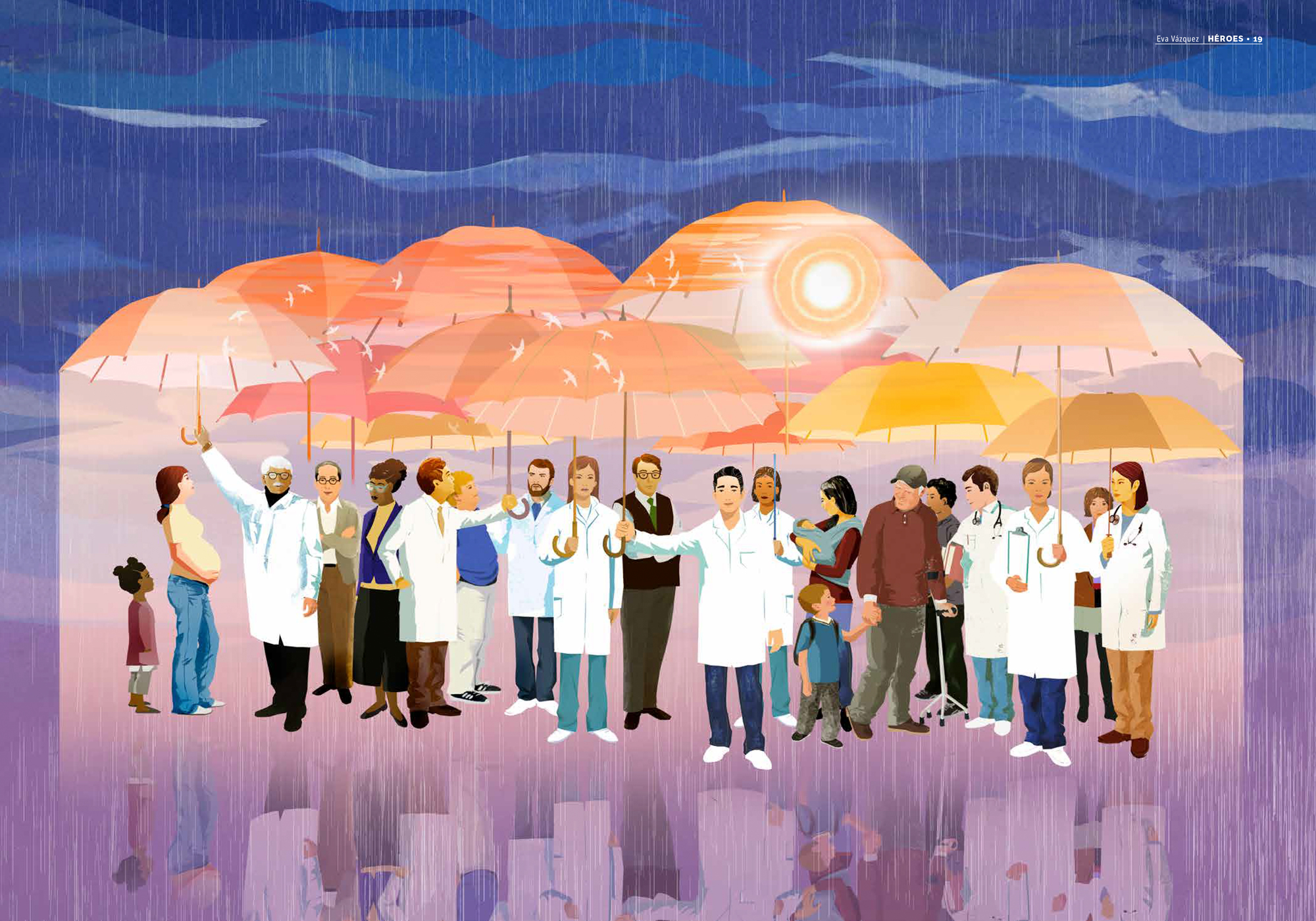 Farmacéuticas, cajeros y reponedoras de supermercado; transportistas, barrenderos y limpiadoras; policías, voluntarias y camioneros; bomberos, dependientes y cuidadoras… Y, sobre todo, sanitarios. Nuestros sanitarios, nuestra salvación, protegiéndonos de la tormenta de la COVID-19 con grandes paraguas llenos de esperanza. La publicación incluye una imagen conceptual, sin EPI ni mascarillas para sentirlos más cercanos, creada por Eva Vázquez, que forma parte de una serie de ilustraciones que rinden homenaje a todos los héroes anónimos de esta crisis.