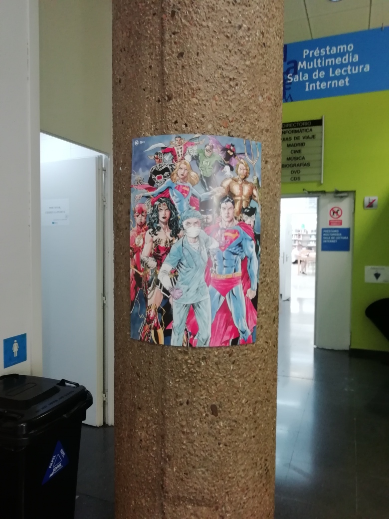 Las editoriales especializadas DC Cómics y ECC Ediciones tuvieron la idea de convertir a médicos y profesionales de la enfermería en superhéroes que combaten la pandemia causada por el coronavirus. Los pósteres llegaron a las librerías de cómics de toda España para que los libreros se las regalaran a sus clientes cuando volvieran a abrir las puertas tras el confinamiento.