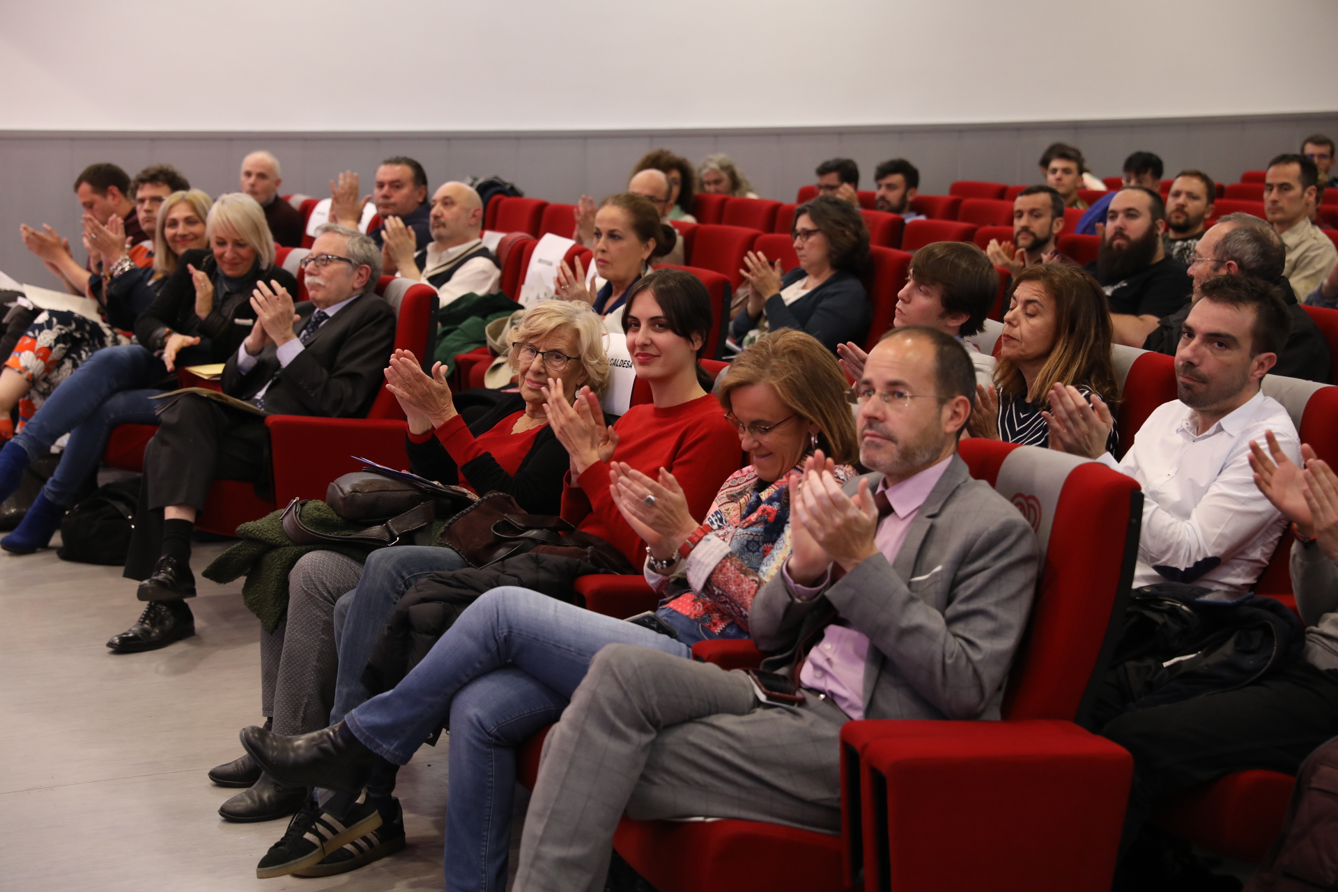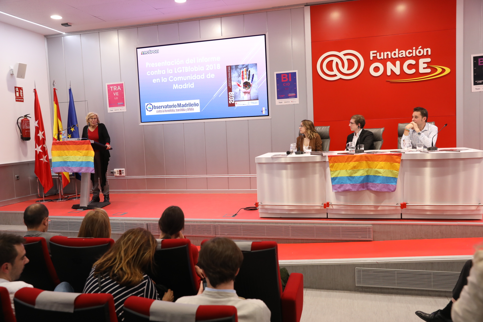 Esta tarde, la alcaldesa de Madrid, Manuela Carmena, ha asistido al acto de presentación del Informe 2018, del Observatorio Madrileño contra la homofobia, transfobia y bifobia, en el que se ha hecho pública la situación de la LGTBfobia en la Comunidad de Madrid. También han participado los alcaldes de Parla, Luis Martínez Hervás, de Bustarviejo, Raúl San Juan y el concejal del Ayuntamiento de Alcalá de Henares, Suso Abad para hablar de políticas LGTB municipales.