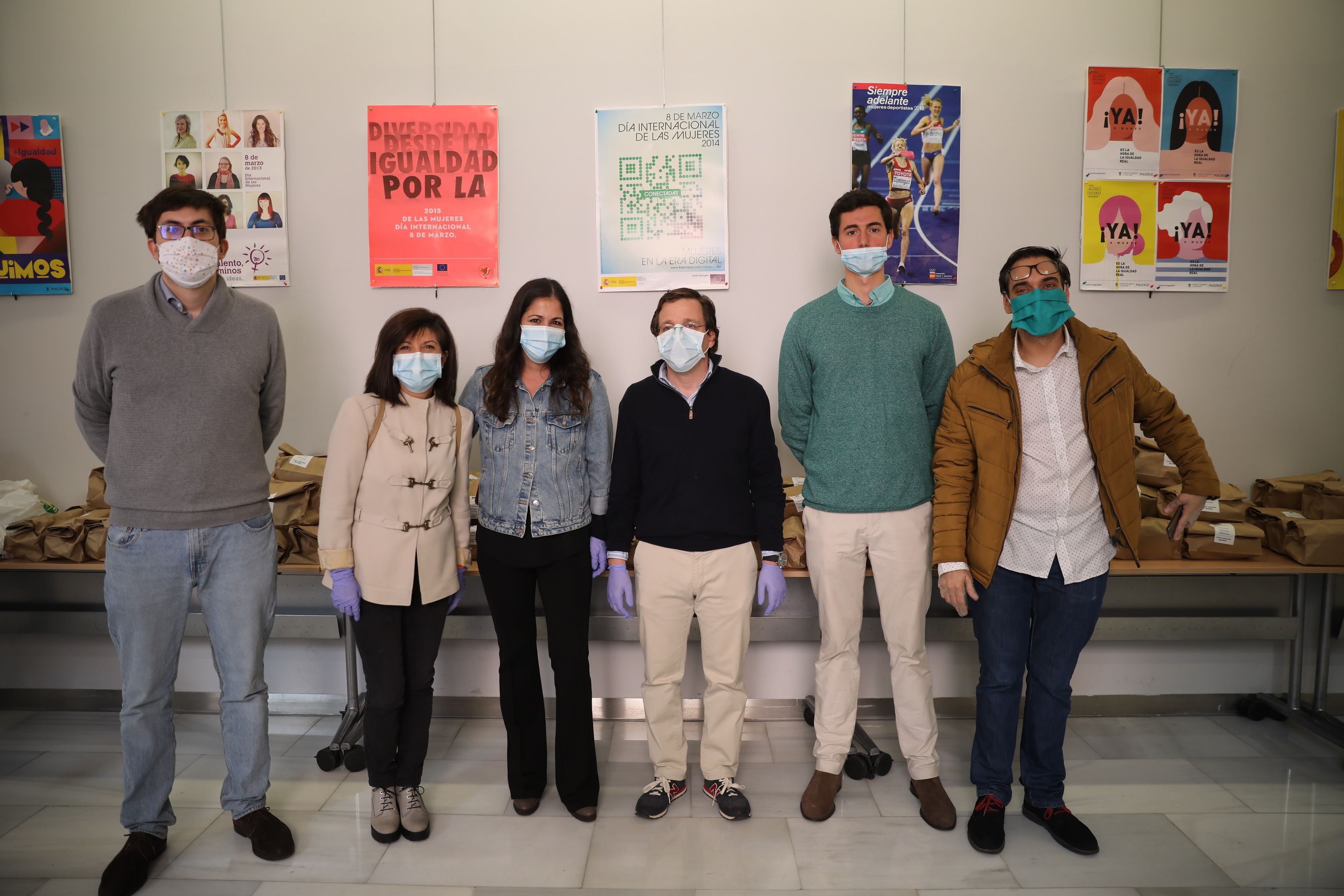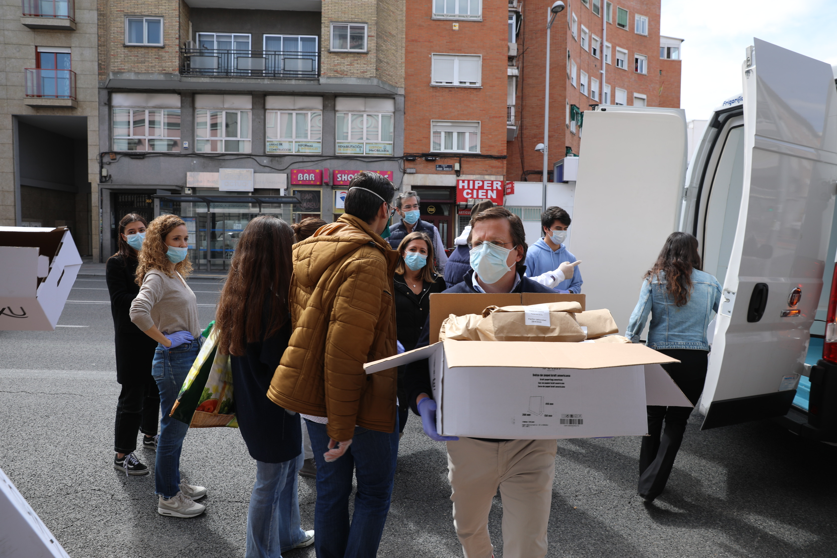 El alcalde de Madrid, José Luis Martínez-Almeida, acompañado de la concejala del distrito, Blanca Pinedo, ha participado hoy en uno de estos repartos de comidas solidarias para responder a la crisis de emergencia motivada por la COVID-19.