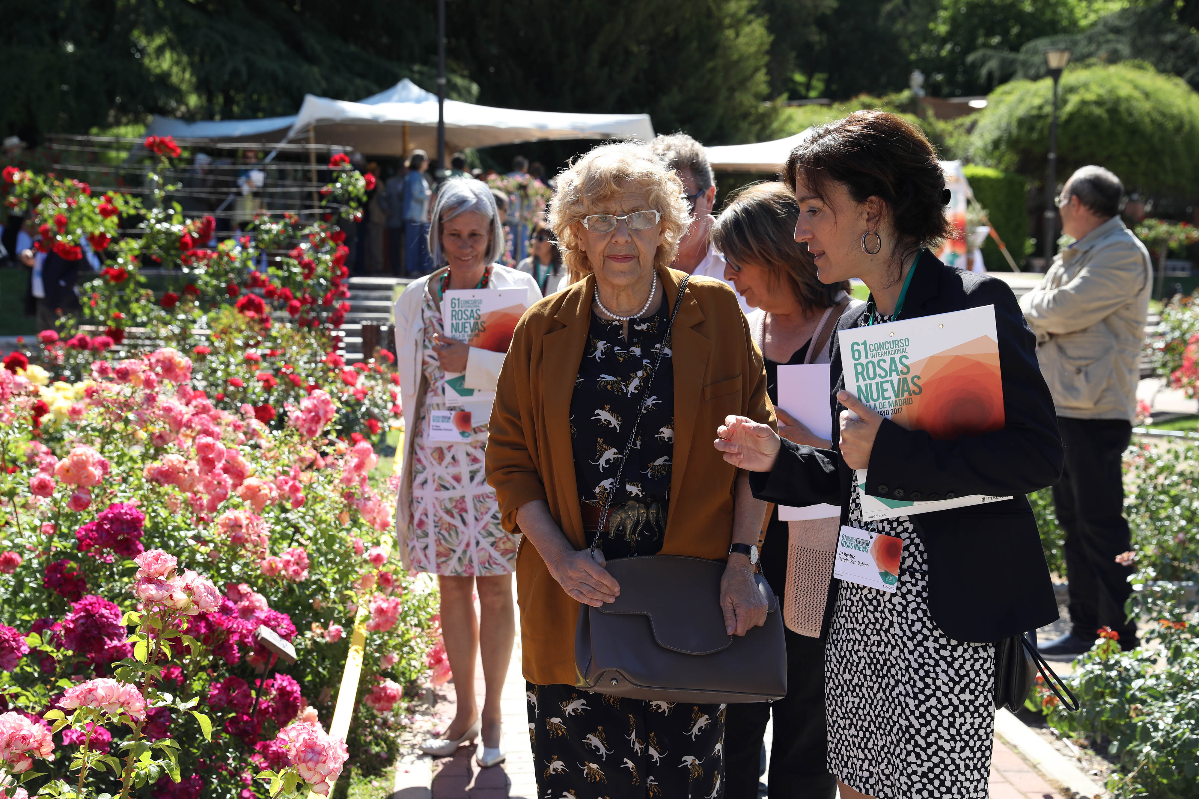 - Antes de la proclamación de los ganadores, la alcaldesa de Madrid, Manuela Carmena, ha realizado una visita por la rosaleda para conocer los rosales que se presentaban al concurso y saludar el jurado internacional