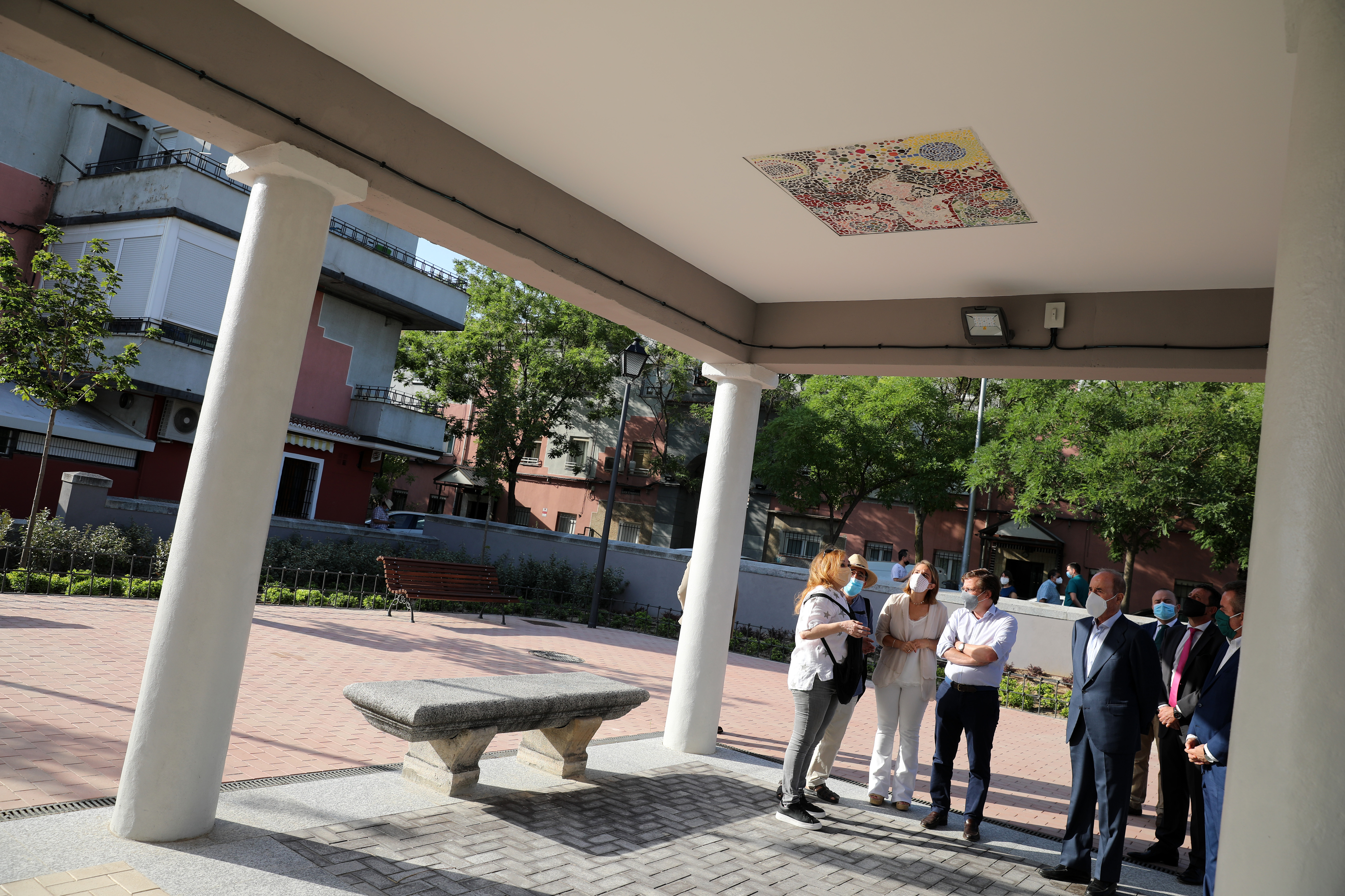 El alcalde ha destacado el proyecto “Platos rotos”, que han llevado a cabo numerosas entidades del distrito, que durante meses han recopilado y trabajado platos rotos de diversa procedencia para construir 11 mosaicos que ahora engalanan el techo de la pérgola. /