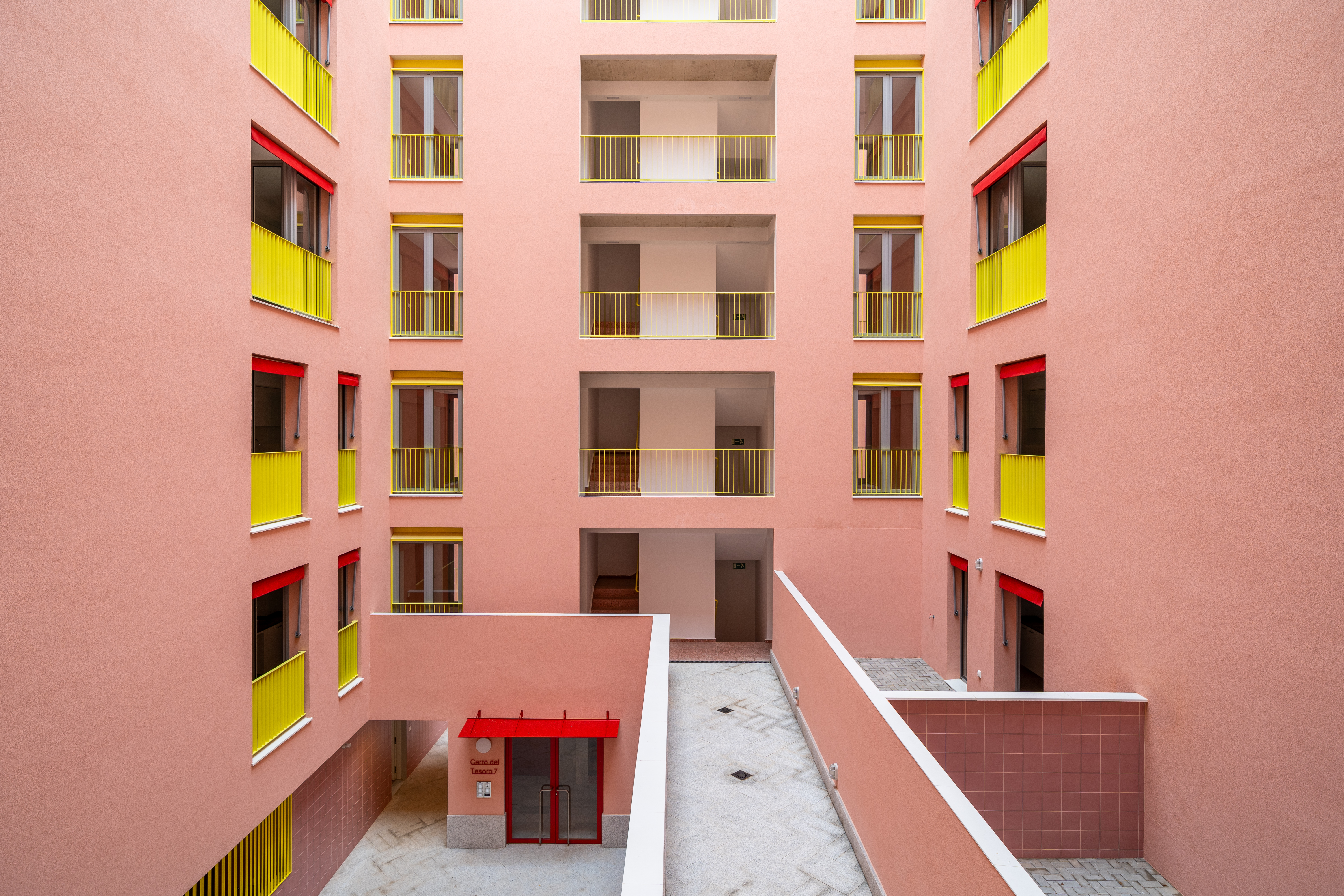 La particularidad de este proyecto reside en que trasforma la tradicional corrala con sus características galerías de acceso y tendido perimetral, todo un escaparate de la vida cotidiana. La promoción consta de un patio interior que alberga los cuatro núcleos donde se disponen las viviendas. De esta forma, se consigue dotar a las viviendas de la privacidad necesaria, a la vez que se garantiza la doble orientación y ventilación cruzada hacia el patio de la corrala.