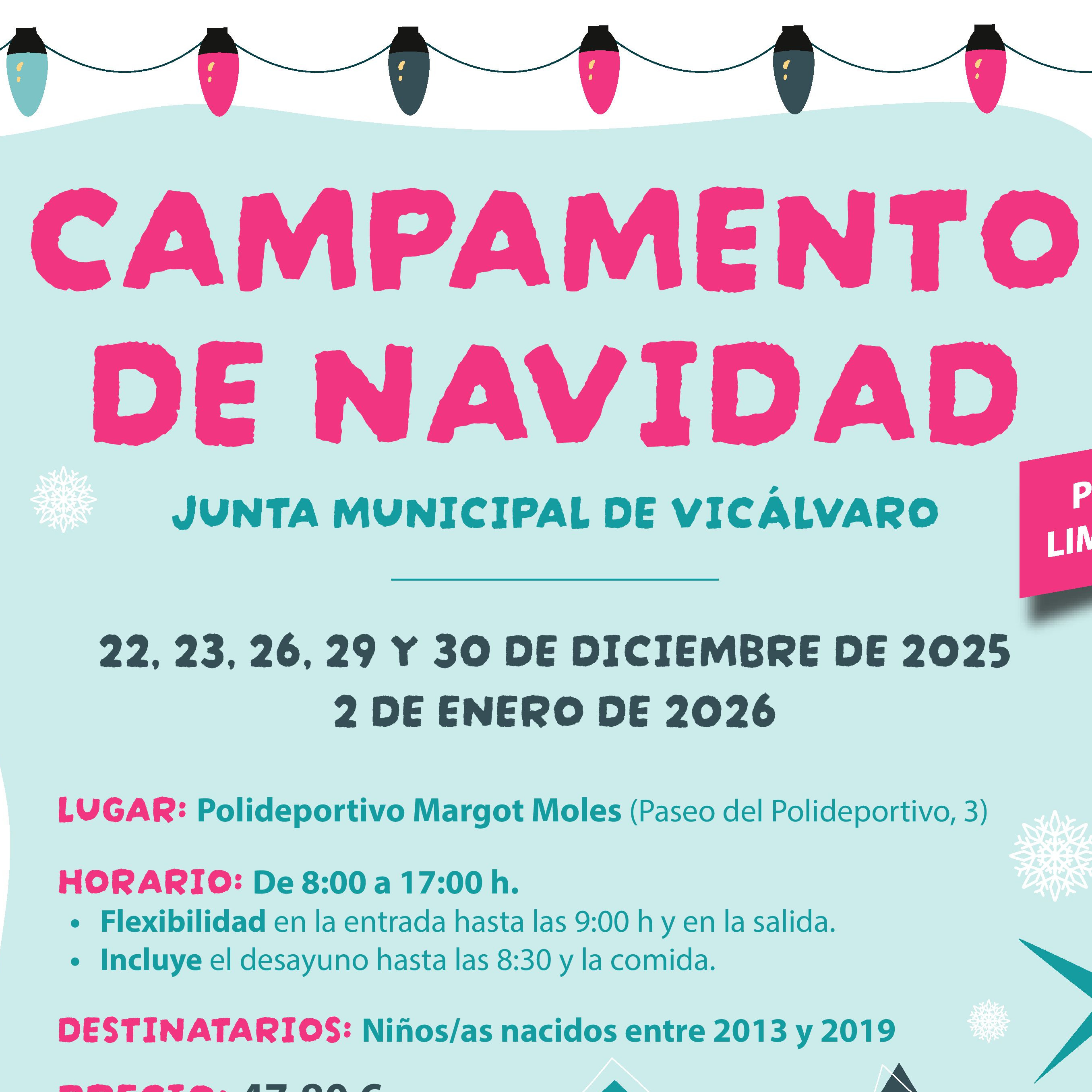 Vicálvaro abre la inscripción para su campamento urbano de NavidadEl distrito de Vicálvaro ha abierto hoy el plazo de inscripción para el campamento urbano de Navidad, que tendrá lugar en el Centro Deportivo Municipal Margot Moles. El objetivo de esta iniciativa consiste en facilitar la conciliación de la vida familiar y laboral de los vecinos del distrito. En total, se ofertan 43 plazas y se realizará los días 22, 23, 26, 29 y 30 de diciembre y 2 de enero, coincidiendo con los días no lectivos de las vacaciones de Navidad.