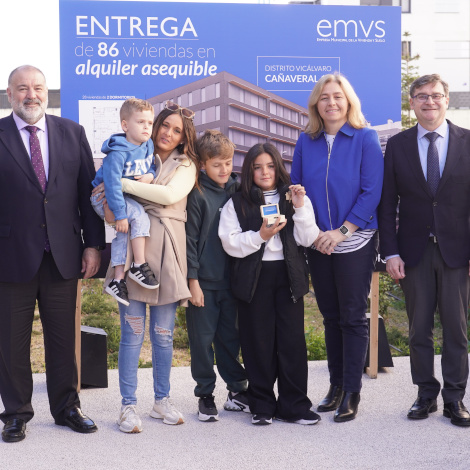 El Ayuntamiento entrega 116 nuevas viviendas de alquiler asequible construidas por EMVS MadridEl Ayuntamiento de Madrid ha entregado 116 nuevas viviendas en el barrio de El Cañaveral, en Vicálvaro. Las familias que ocuparán estas nuevas viviendas de alquiler asequible, construidas por la Empresa Municipal de la Vivienda y Suelo de Madrid (EMVS Madrid), han recibido esta mañana las llaves de manos del delegado de Políticas de Vivienda y presidente de EMVS Madrid, Álvaro González.