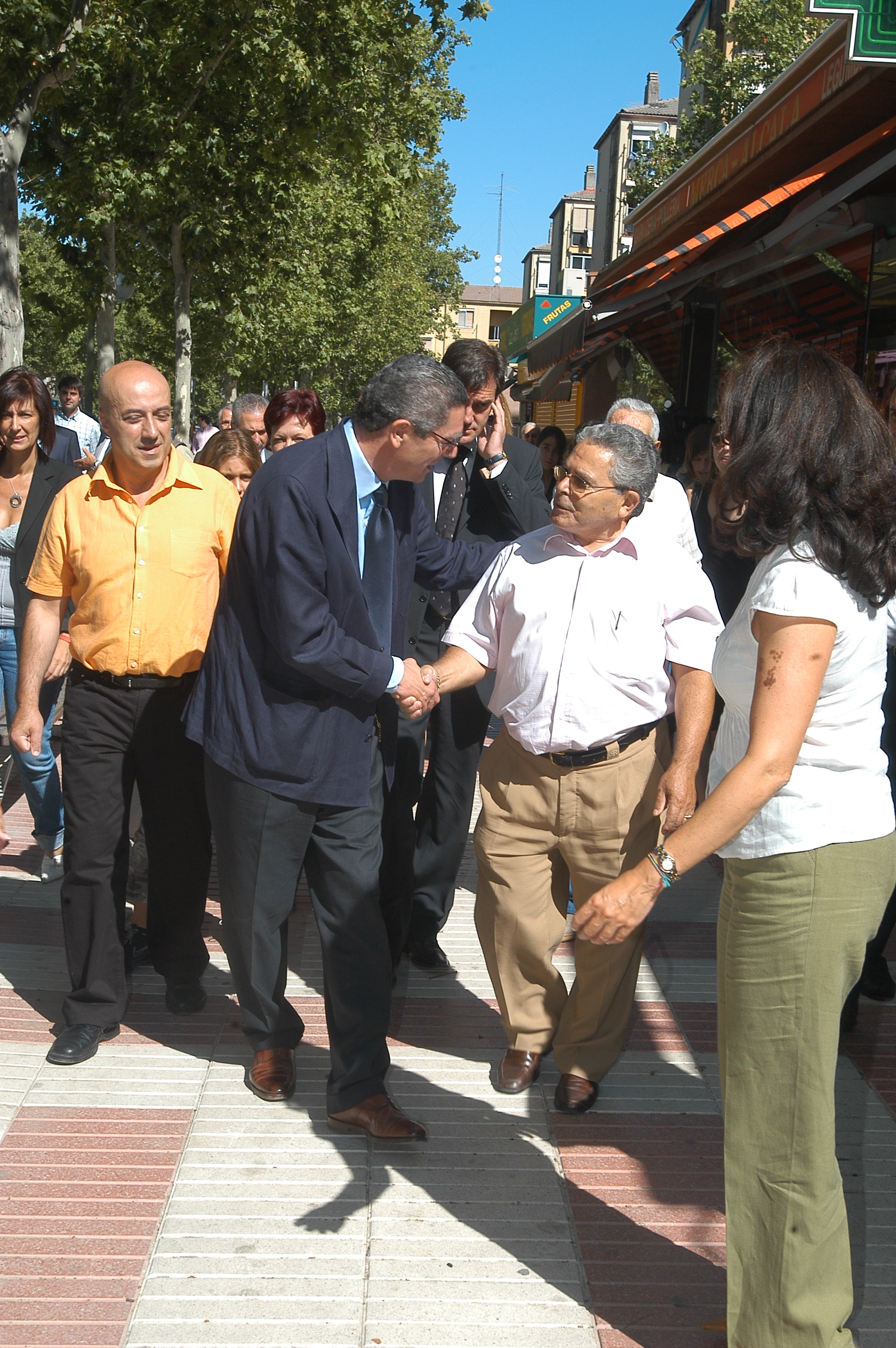 El alcalde de la Ciudad de Madrid, Alberto Ruiz-Gallardón, durante el recorrido que ha realizado a los ejes comerciales de las calles de Amposta y de Virgen de la Oliva, en San Blas, con motivo del inicio de las obras de remodelación, en las que el Ayuntamiento va a invertir cerca de 3,6 millones de euros.
