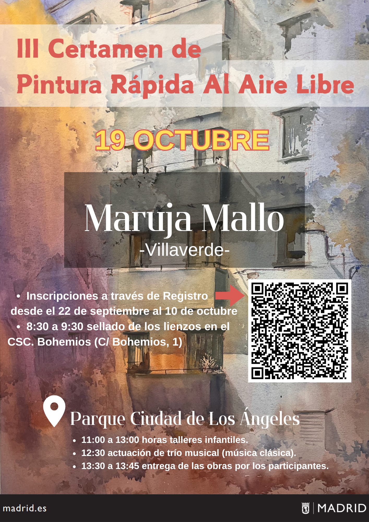 La Junta Municipal de Villaverde ha convocado el III Certamen de pintura rápida al aire libre Maruja Mallo, que se celebrará el sábado 19 de octubre con el fin de promover el desarrollo artístico y fomentar la creatividad y las técnicas de las artes plásticas mediante la pintura.