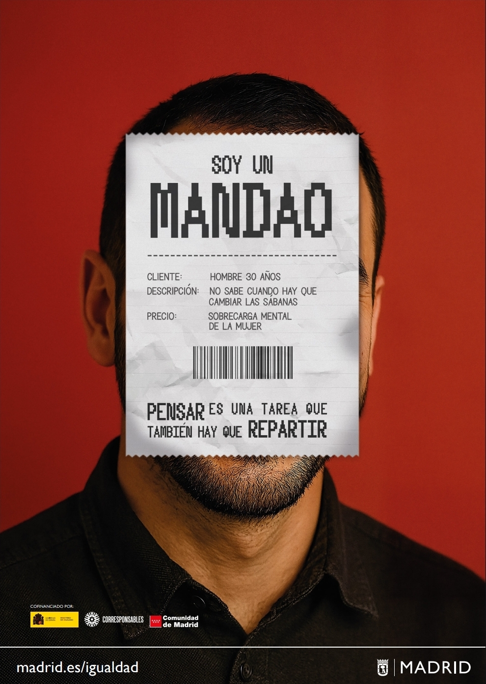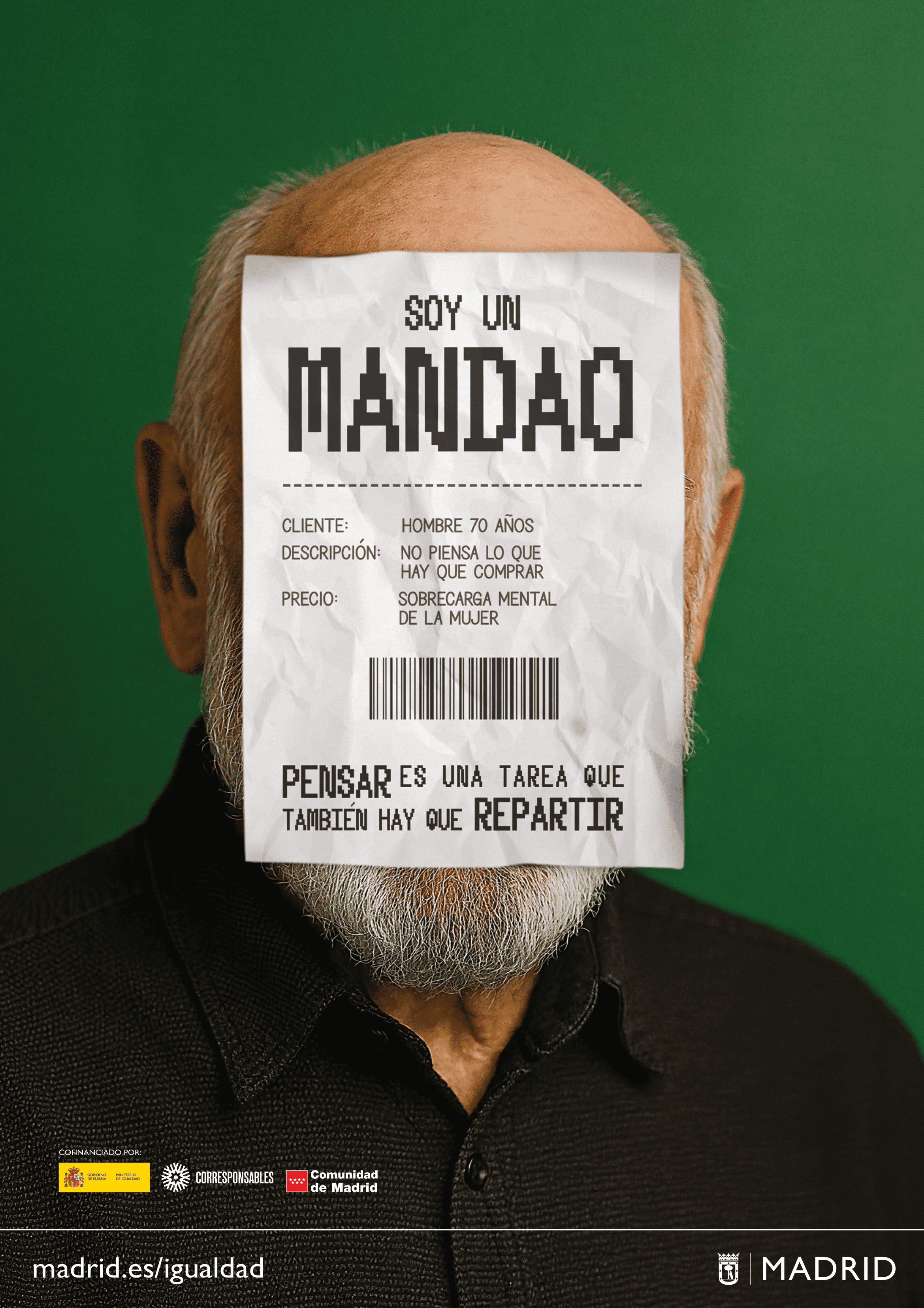 La campaña se plantea a través de tres piezas principales correspondientes a los semblantes de tres hombres adultos (30, 50 y 70 años), cuya parte central del rostro se muestra oculta por un tique de compra con los datos siguientes: cliente, descripción y precio, acompañados de la frase 'SOY UN MANDAO' y el lema de la campaña 'PENSAR ES UNA TAREA QUE TAMBIÉN HAY QUE REPARTIR'.