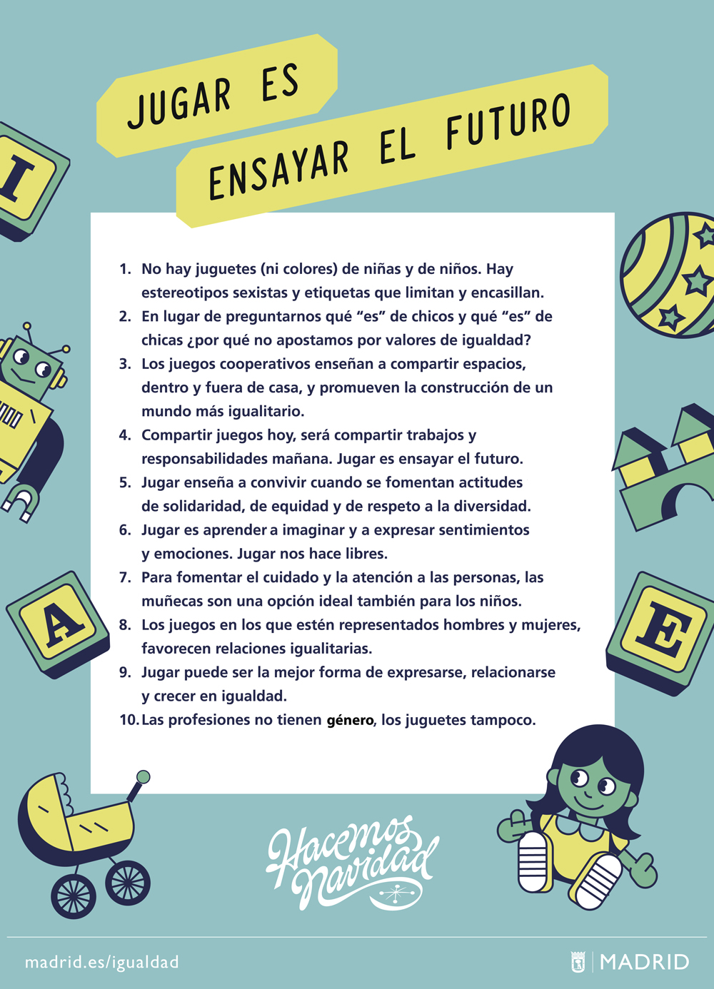 Con motivo de las fechas navideñas y las compras de regalos asociadas a este periodo, durante el mes de diciembre de 2016 el Ayuntamiento de Madrid difunde la campaña “Jugar es ensayar el futuro” con el objetivo de contribuir a la sensibilización para la eliminación de roles y estereotipos sexistas, promoviendo la elección de juguetes igualitarios a través de una serie de pistas que nos ayudan a elegir los juegos y juguetes sin género: