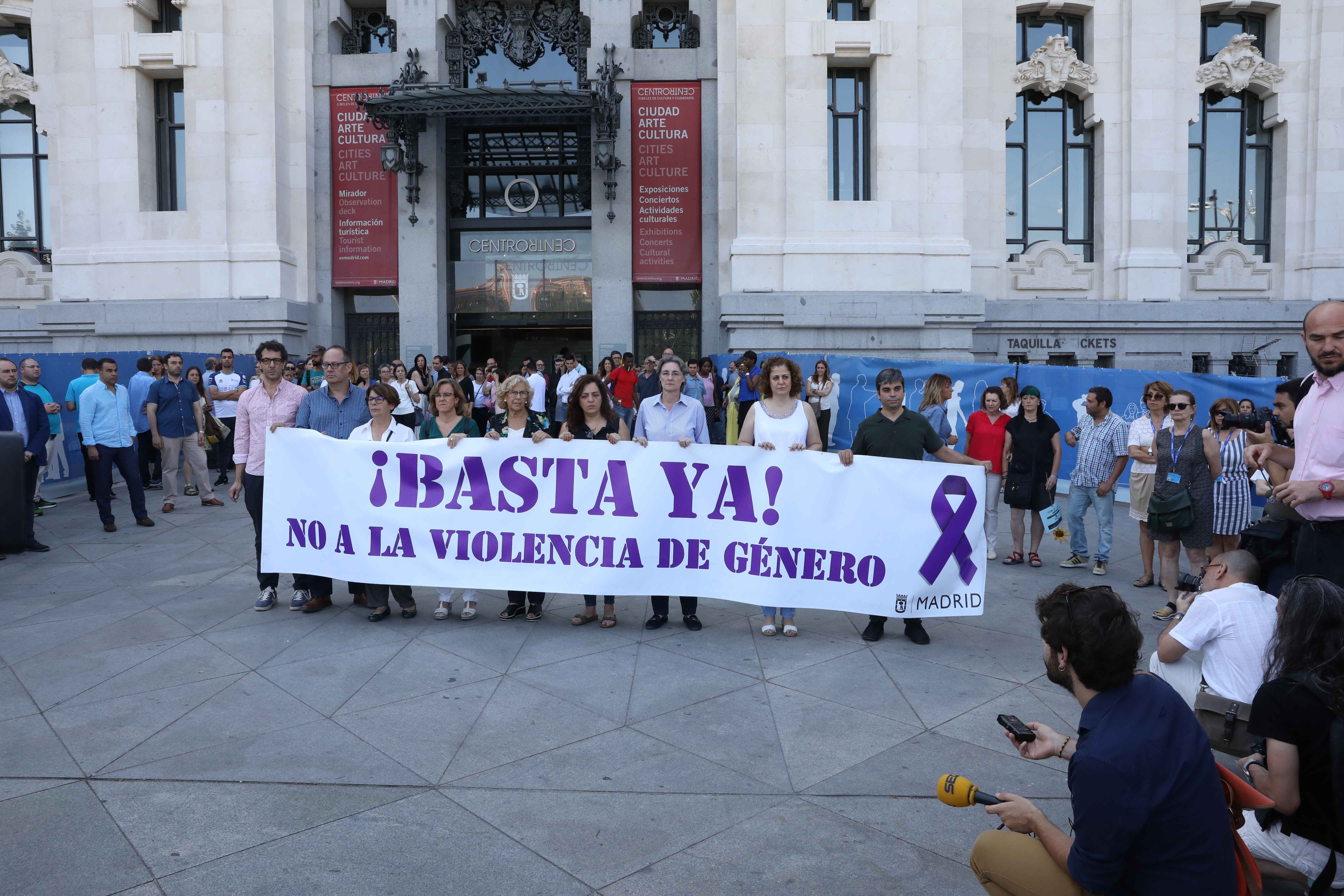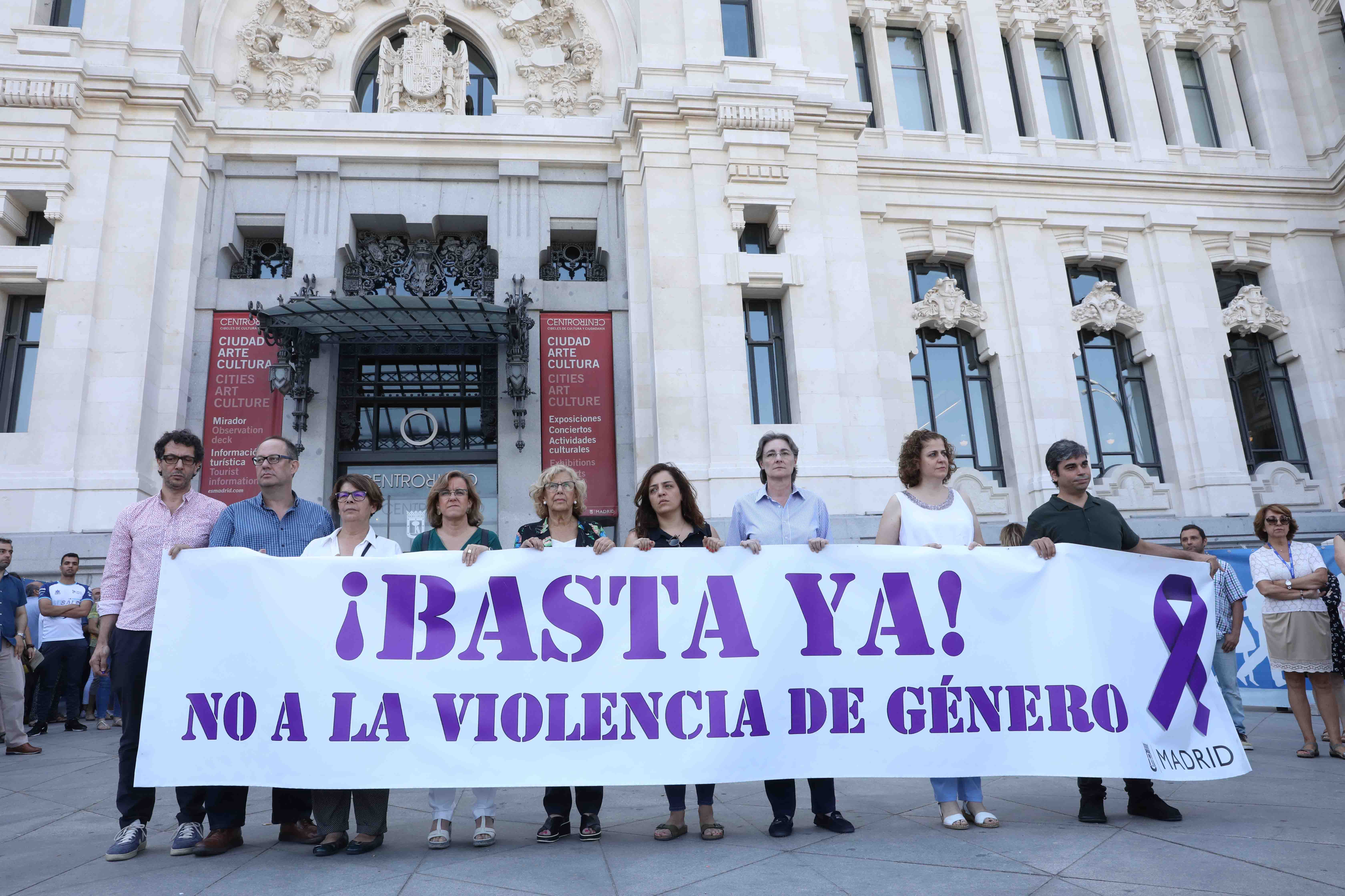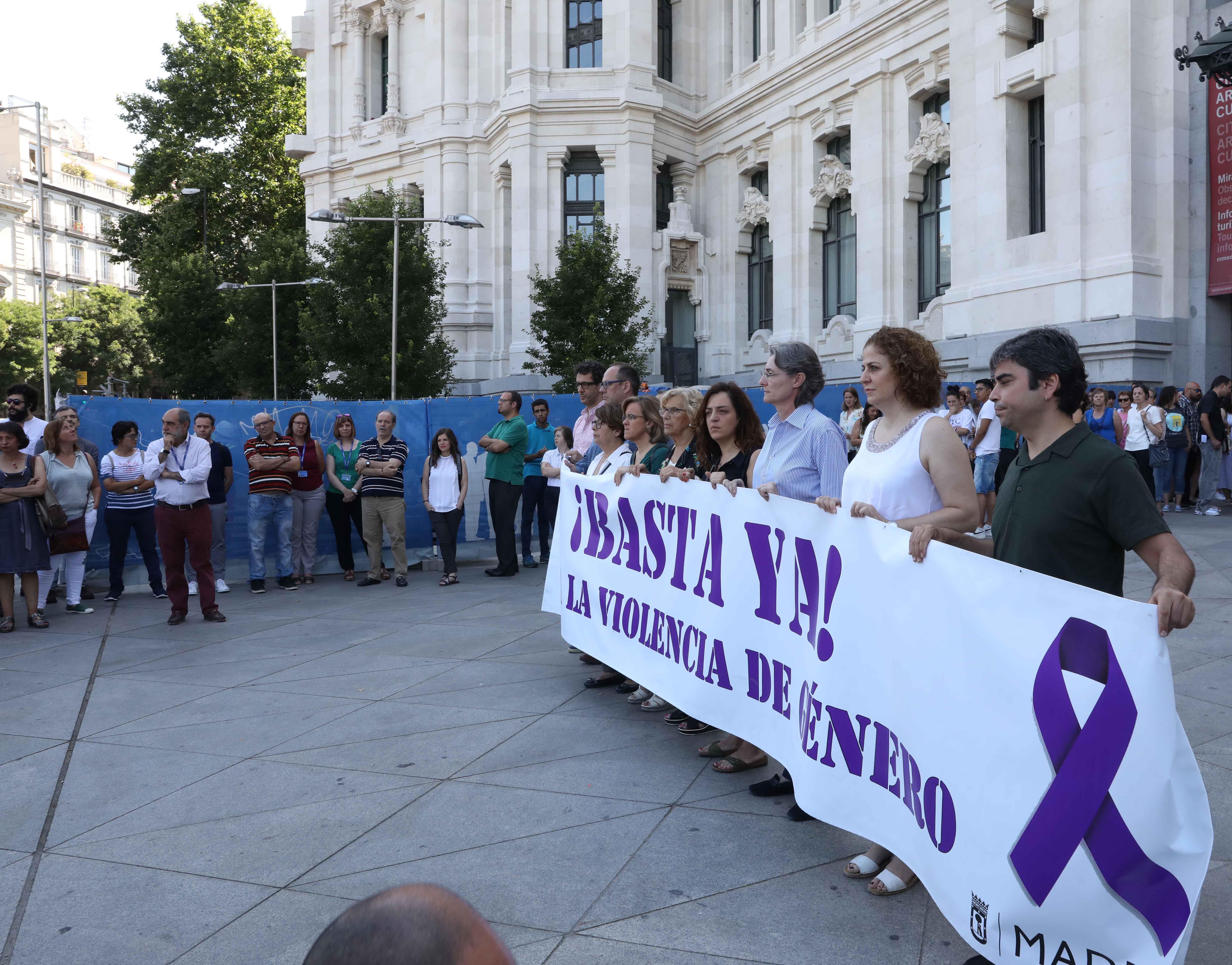 La alcaldesa de Madrid, Manuela Carmena; la delegada de Políticas de Género y Diversidad, Celia Mayer; acompañadas de otros miembros del equipo de Gobierno municipal y representantes de los demás grupos del Ayuntamiento de Madrid han guardado hoy martes, 10 de julio, a las 11 horas, un minuto de silencio ante el palacio de Cibeles como muestra de repulsa y condena por el asesinato, presuntamente por violencia de género, de A. I., de 48 años, vecina de Collado Villalba (Madrid), sucedido el 9 de julio de 2018.