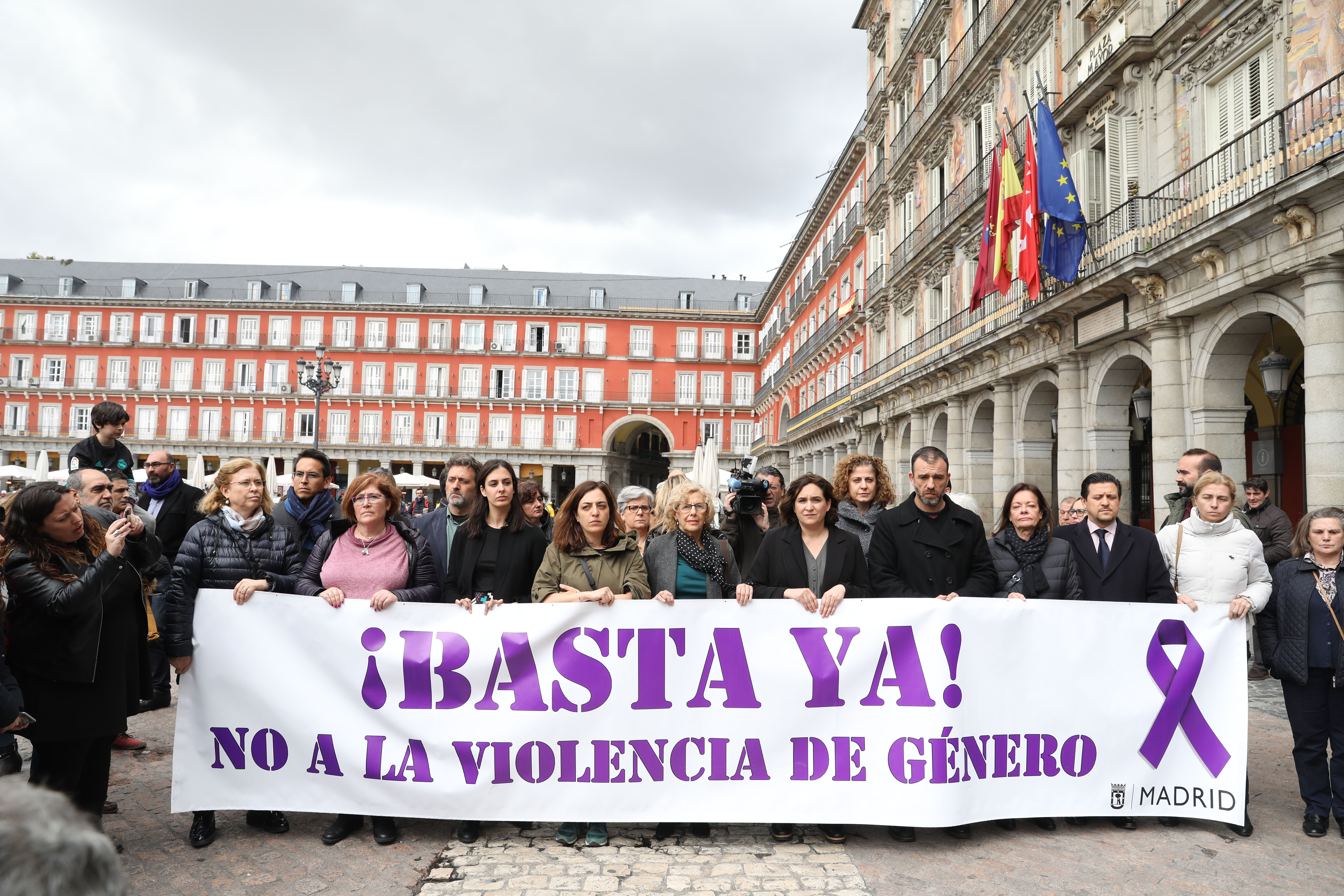 La alcaldesa de Madrid, Manuela Carmena; la delegada de Políticas de Género y Diversidad, Celia Mayer; y la alcaldesa de Barcelona, Ada Colau, acompañadas de varios miembros de la corporación municipal y trabajadores y trabajadores municipales, han guardado este mediodía un minuto de silencio ante la Casa de la Panadería, en la Plaza Mayor, como muestra de repulsa y condena por la muerte de D.V.S, vecina de Madrid, asesinada el pasado 24 de marzo en Santa Cruz del Retamar, Toledo.