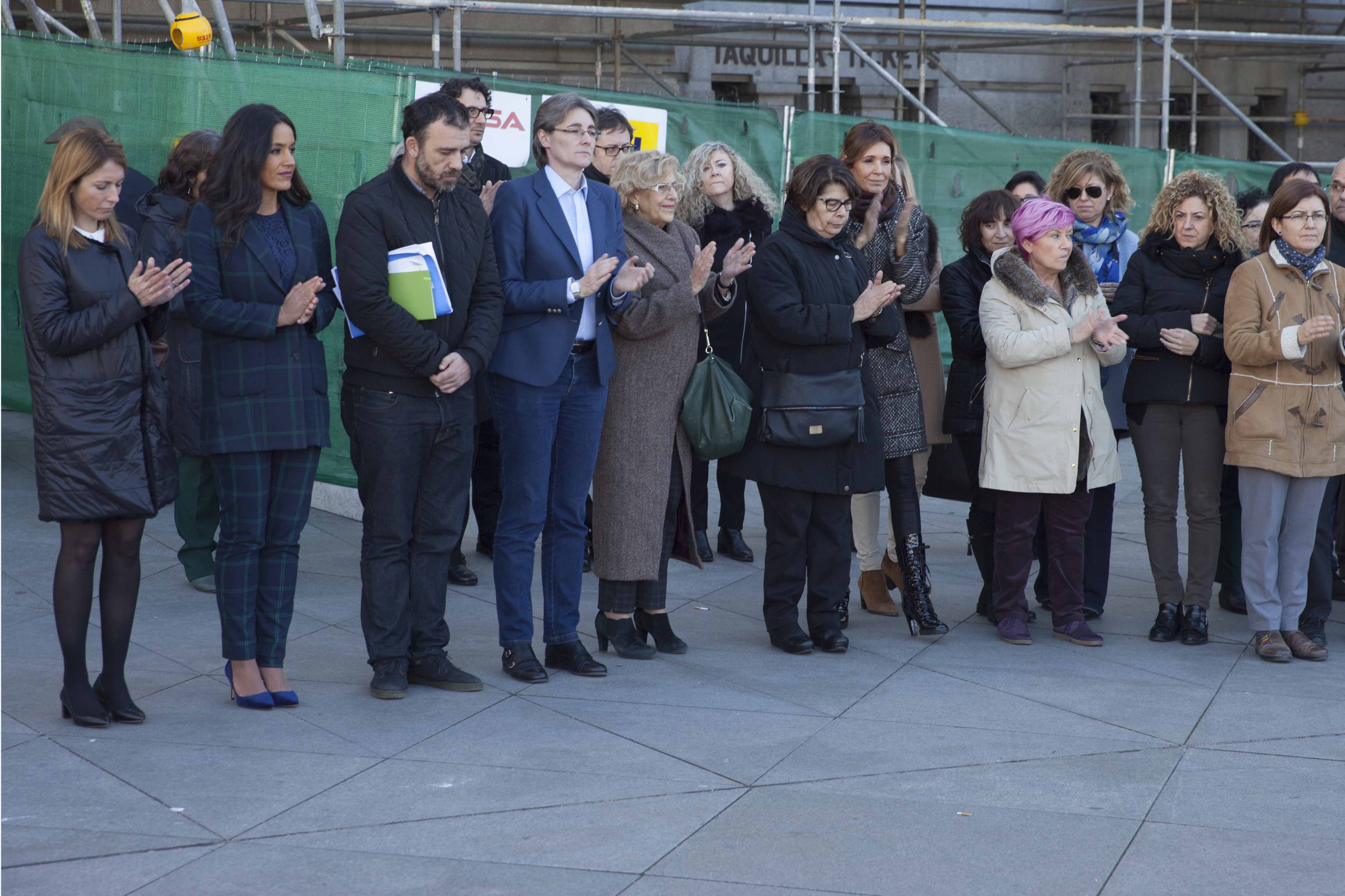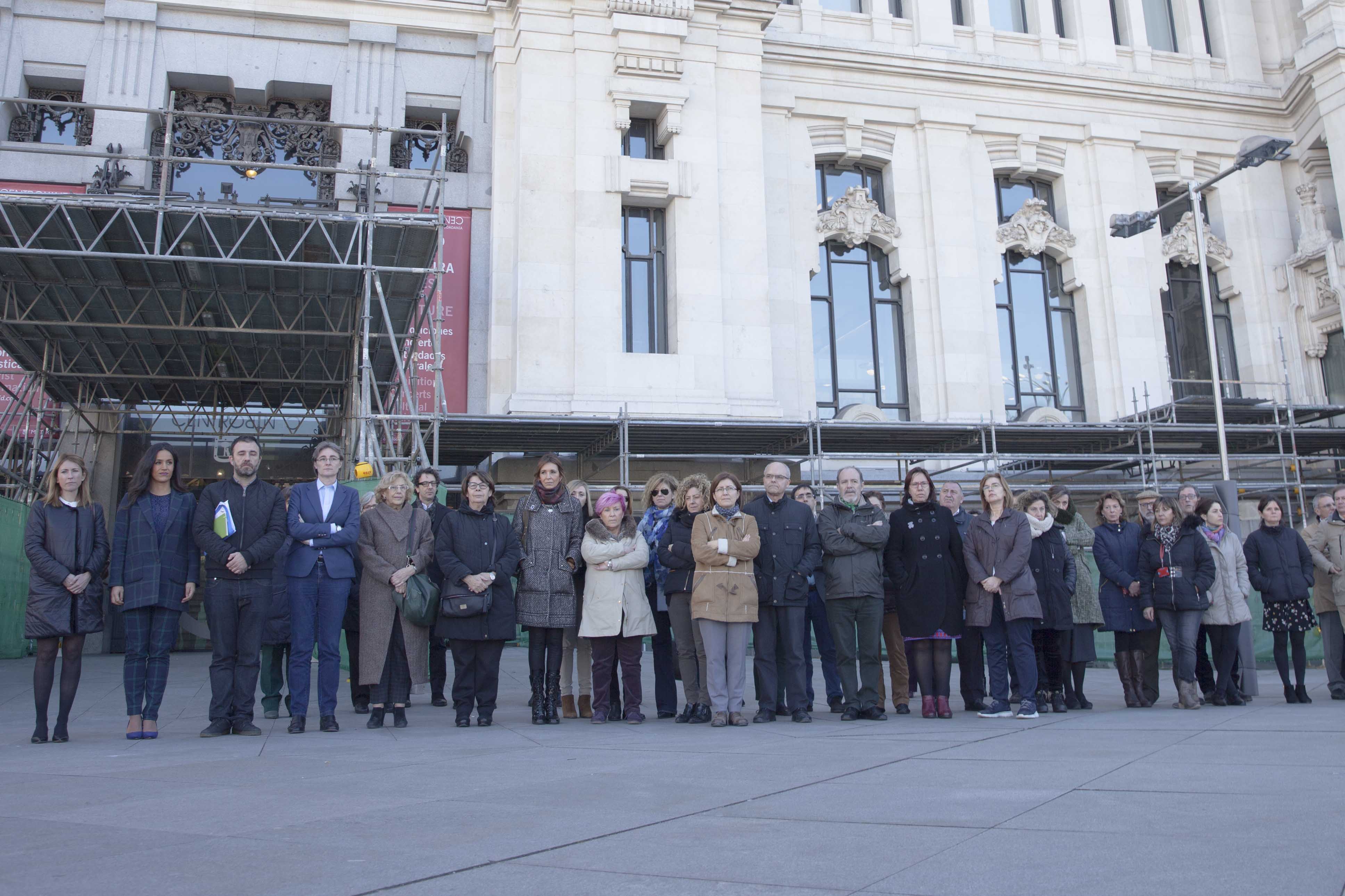 La alcaldesa de Madrid, Manuela Carmena, acompañada por la delegada del Área de Equidad, Derechos Sociales y Empleo, Marta Higueras, y otros miembros de la Corporación municipal, ha guardado a mediodía de hoy un minuto de silencio ante el palacio de Cibeles por la niña de un año asesinada el pasado viernes por su padre en el hospital La Paz, de Madrid.