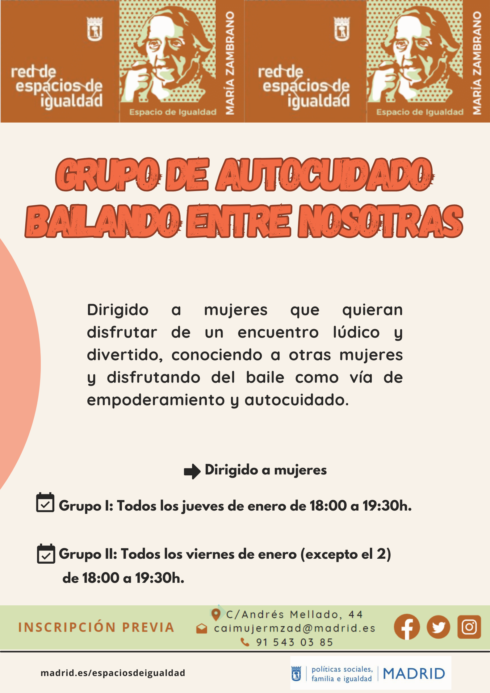 Grupo de autocuidado: bailando entre nosotras [Mujeres Compartiendo Sabiduría]Del jueves 8 de enero de 2026 al viernes 30 de enero de 2026