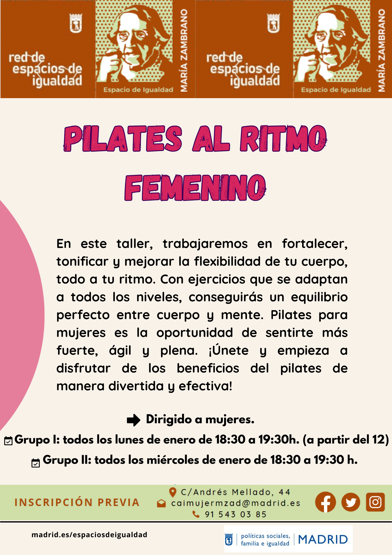 Pilates al ritmo femenino [Mujeres Compartiendo Sabiduría]Del miércoles 7 de enero de 2026 al miércoles 28 de enero de 2026
