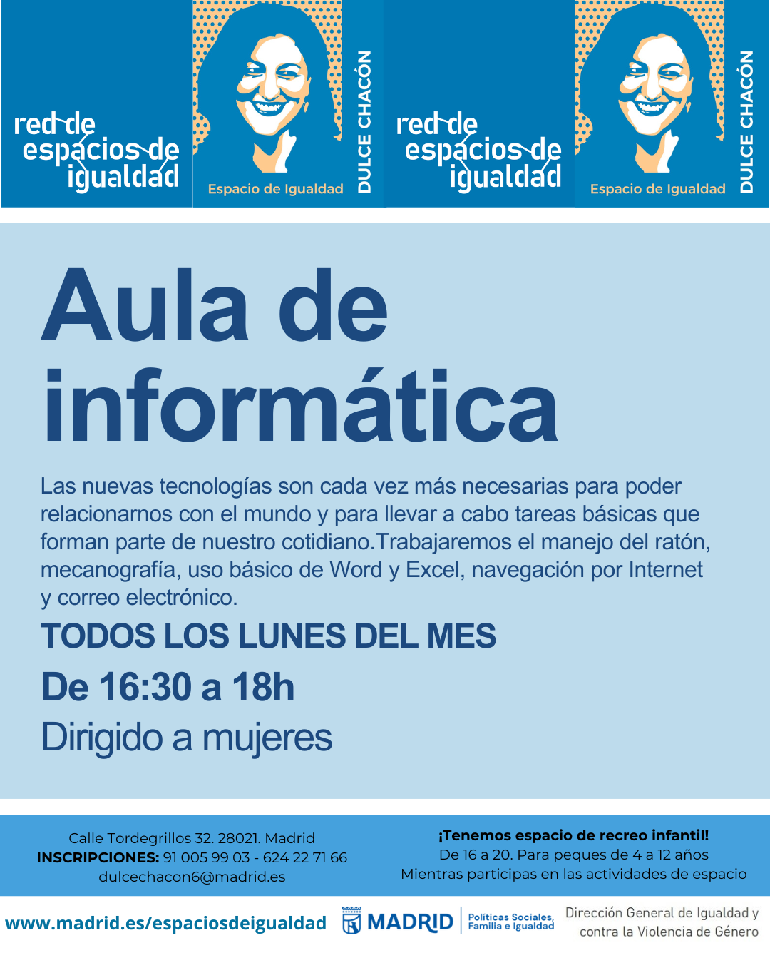 Aula de informática. Espacio de Igualdad Dulce ChacónDel lunes 6 de abril de 2026 al lunes 27 de abril de 2026