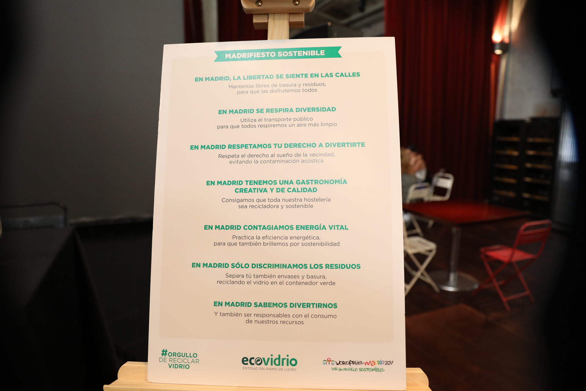 El World Pride 2017 tendrá una estrategia de sostenibilidad, gracias al acuerdo alcanzado entre el Ayuntamiento de Madrid y AEGAL, asociación organizadora del World Pride Madrid 2017, en colaboración con Ecovidrio. La utilización de vasos retornables, la compensación de gases de efecto invernadero a través de la plantación de un bosque, la instalación de contenedores de reciclaje o la utilización de tecnologías eficientes son algunas de las medidas que se pondrán en marcha para evitar o minimizar los impactos ambientales de este evento.