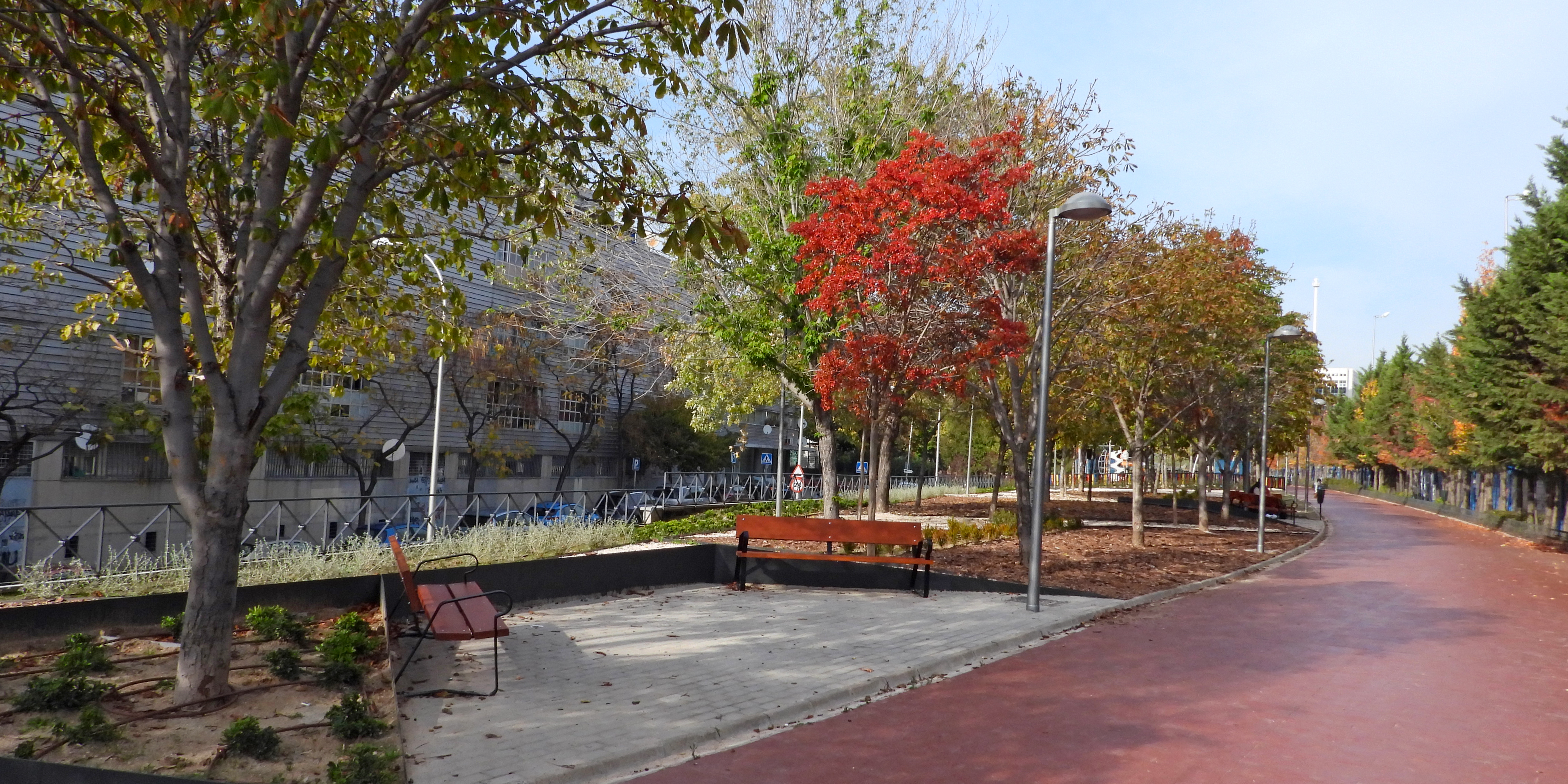 - Ejemplares arbóreos: liquidámbar (Liquidambar styraciflua), ciprés de Leyland (Cupressus × leylandii), árbol de Júpiter (Lagerstroemia indica) y pino piñonero (Pinus pinea).