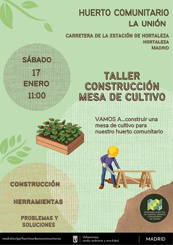 Taller de “Montaje mesa de cultivo” en el huerto La Unión: sábado 17 de enero a las 11:00 h