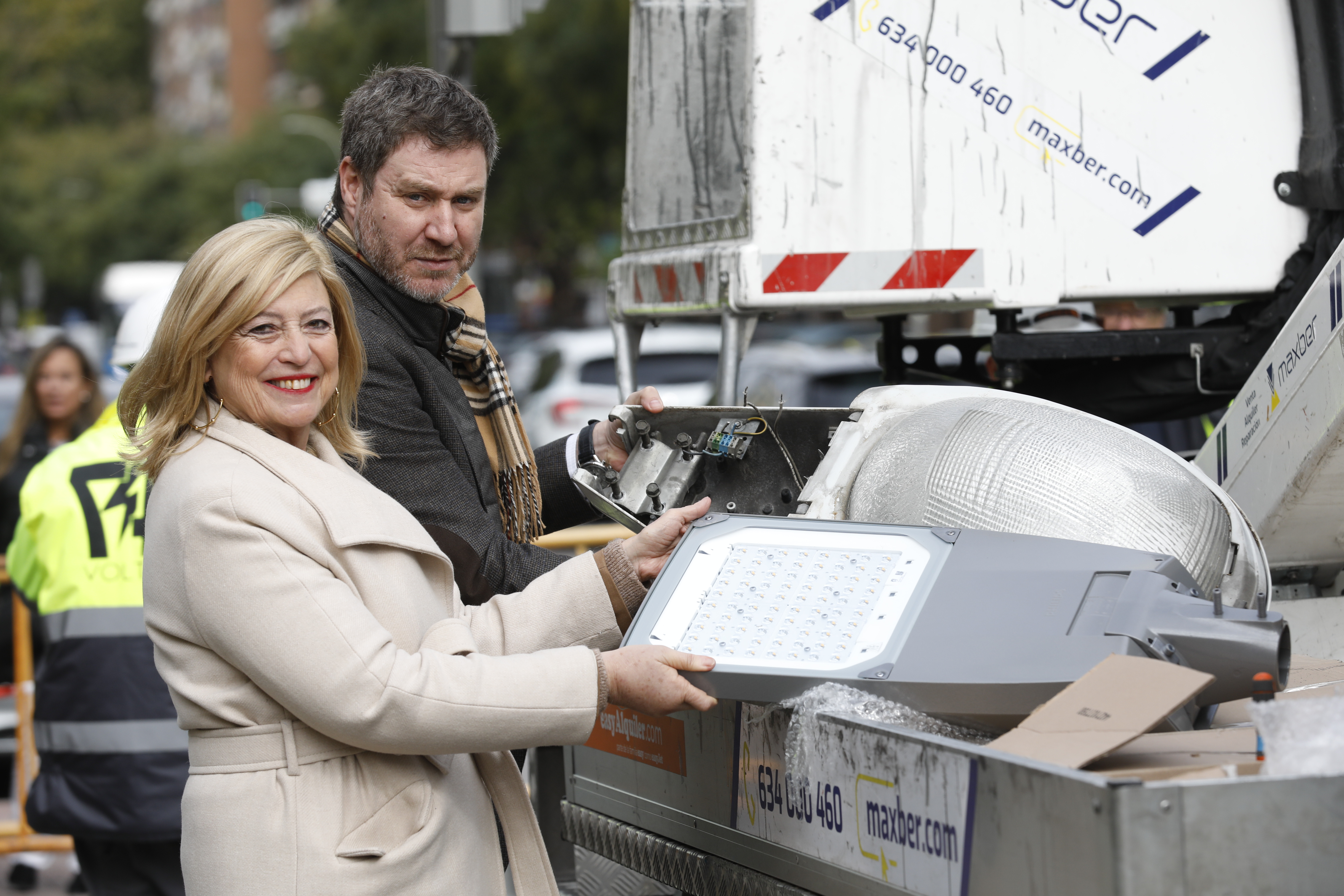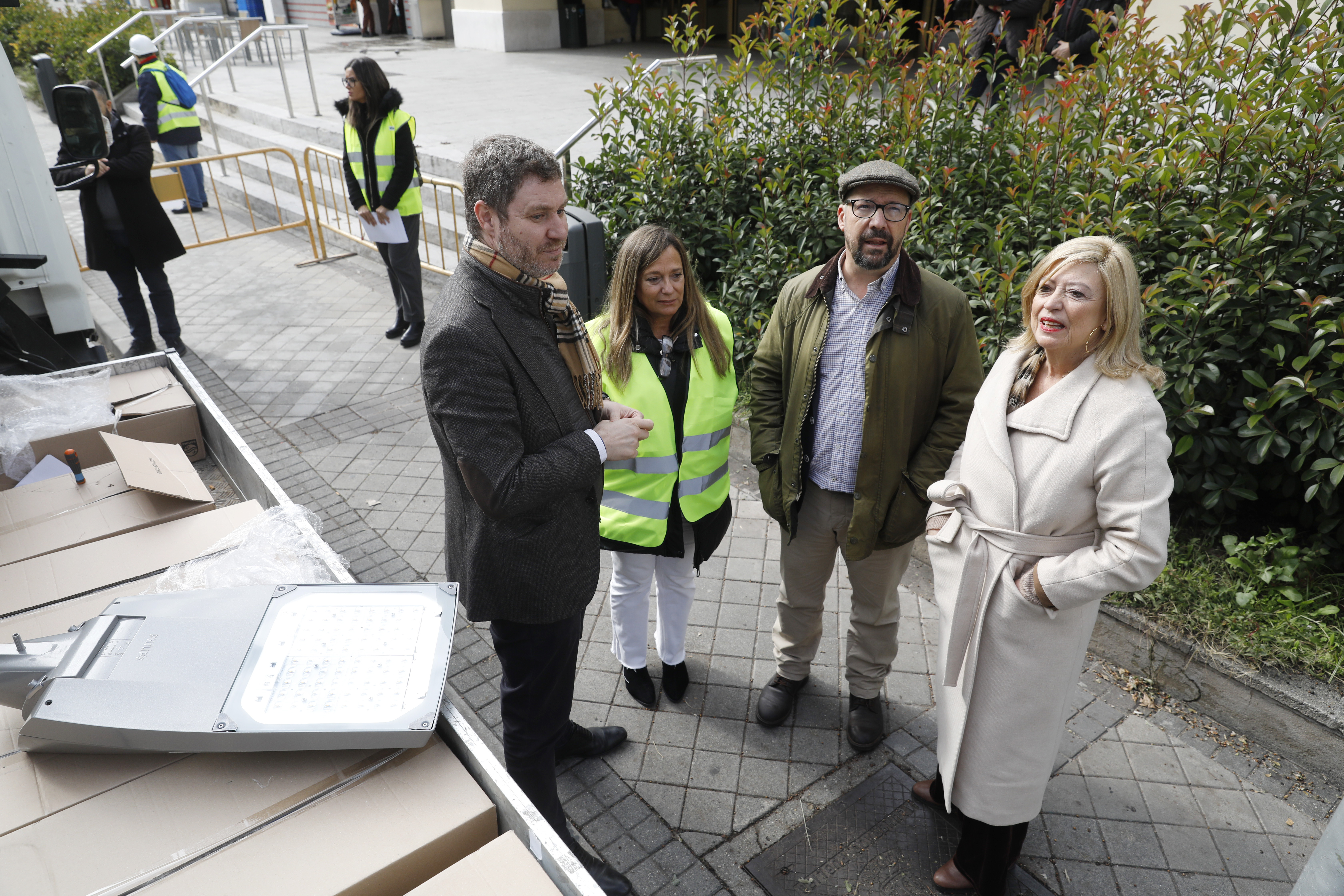 La delegada de Obras y Equipamientos, Paloma García Romero, acompañada del concejal de Latina, Alberto González, ha supervisado esta mañana la renovación de luminarias por tecnología led de alta eficiencia energética que el Ayuntamiento está desarrollando en el paseo de la Ermita del Santo. Estos trabajos forman parte de las actuaciones en el mismo sentido que el Área de Obras y Equipamientos está ejecutando simultáneamente en los distritos de Carabanchel, Villaverde, Tetuán, Puente de Vallecas y Latina.