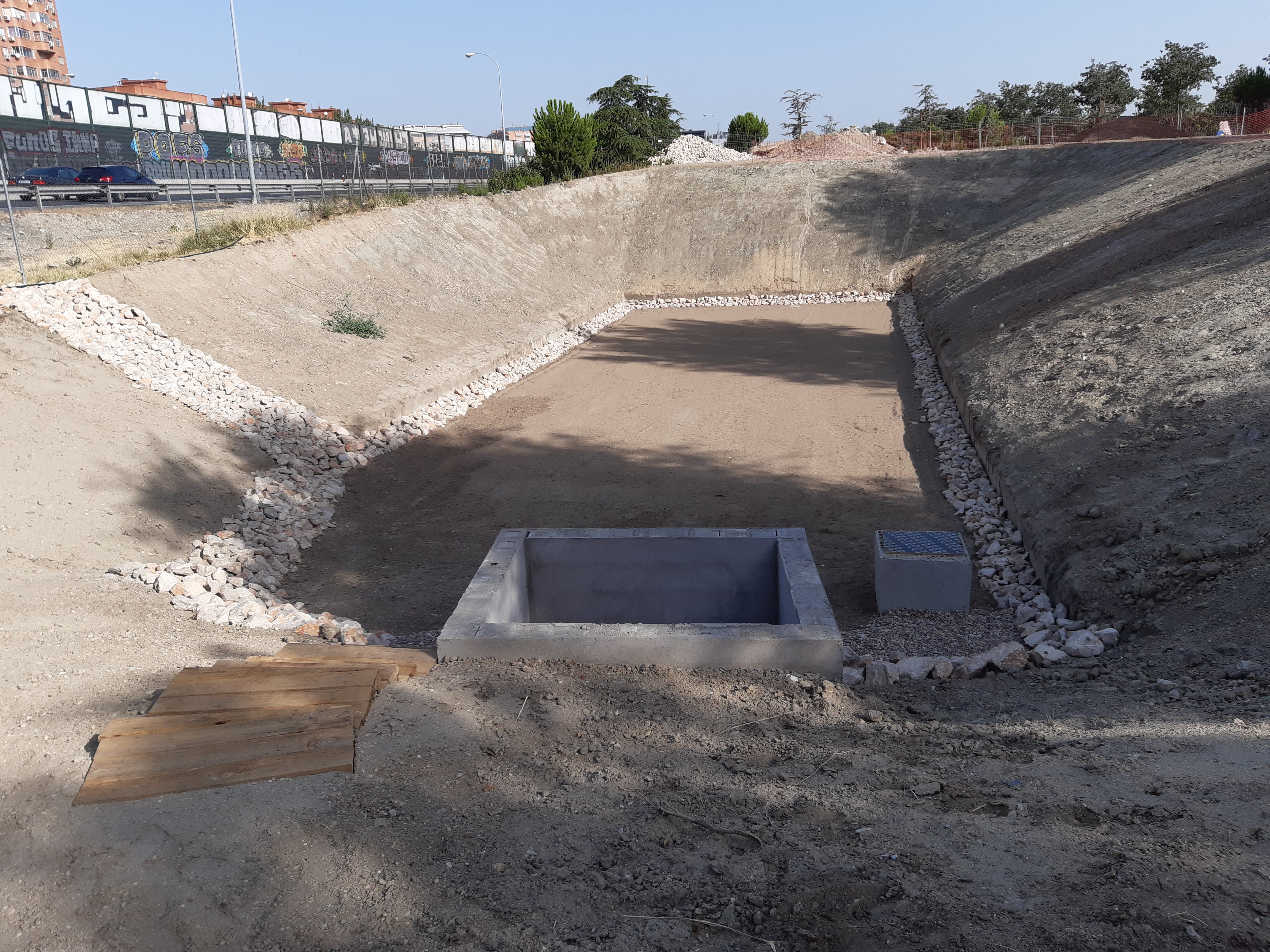 Jardín de lluvia complementario al sistema de drenaje del Parque Lineal del Manzanares en el entorno del paso inferior de Concepción de la Oliva