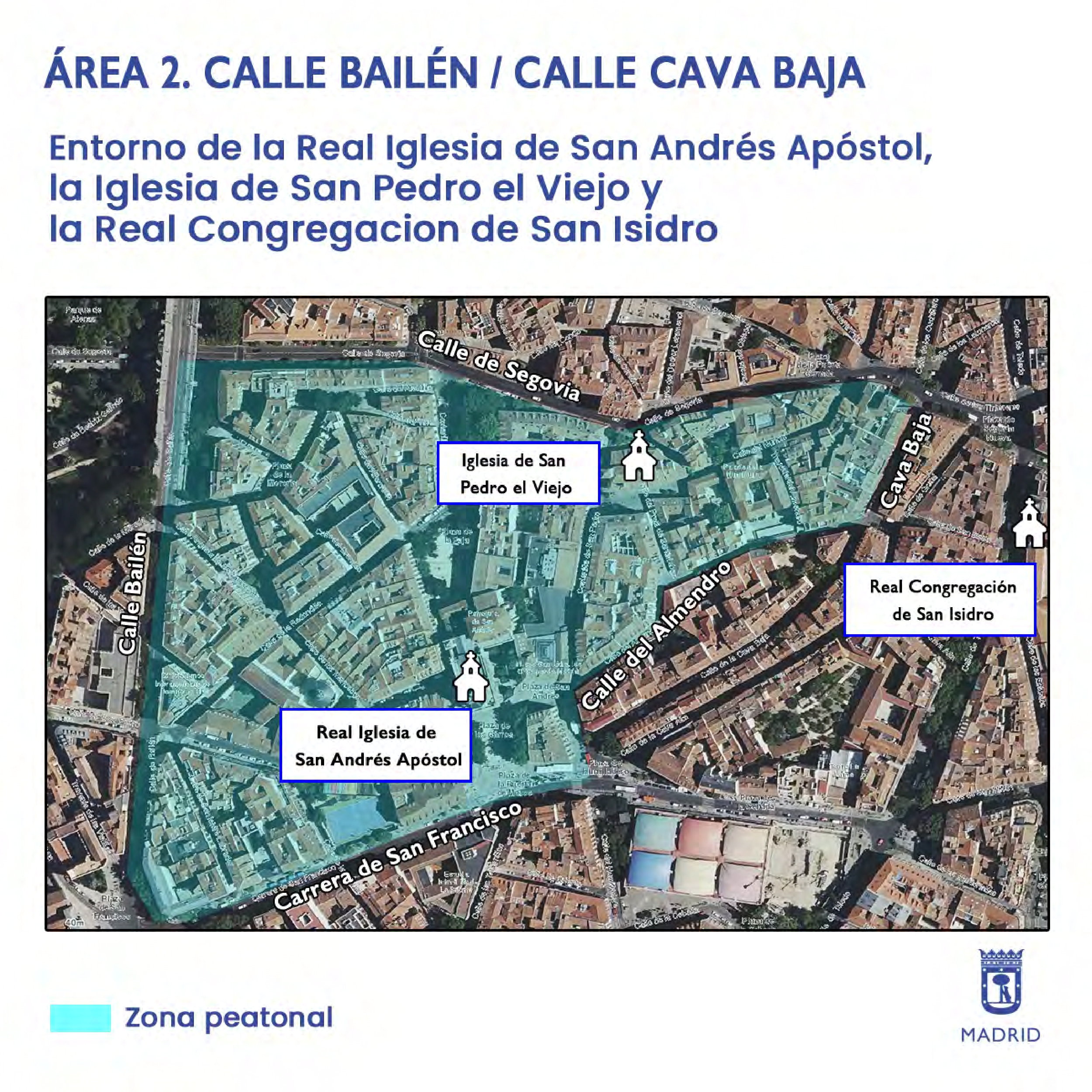 El perímetro se efectuará con los cortes de Costanilla de San Andrés con calle de Segovia y con Costanilla de San Pedro; calle del Almendro con calle de la Cava Baja; calle Bailén con calle Angosta de los Mancebos y calle Don Pedro, y calle del Nuncio. Esta zona peatonal supone el corte de 4 calles y la peatonalización de 19 vías interiores.