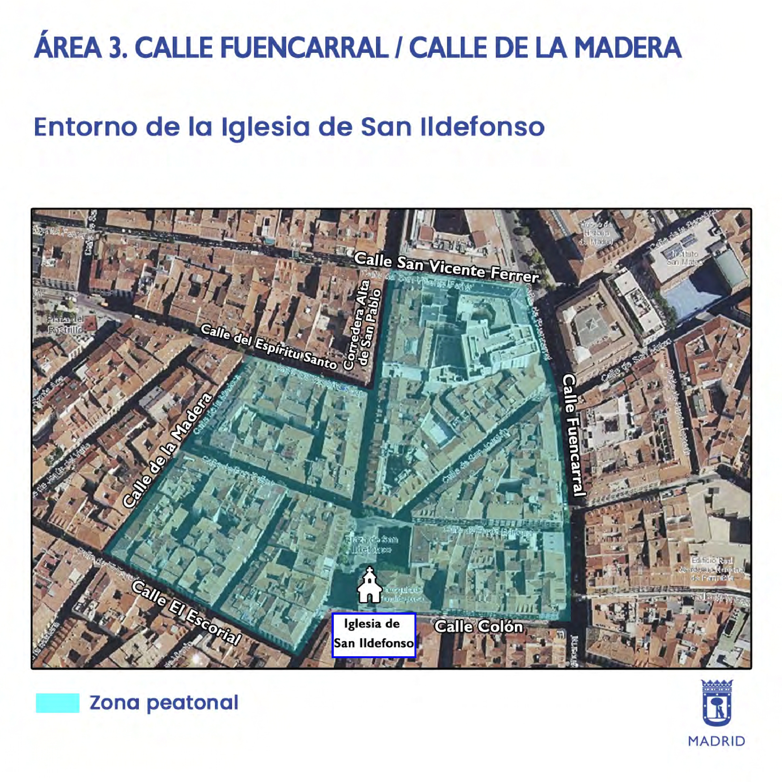 Este espacio peatonal tiene como epicentro la Iglesia de San Ildefonso, de la Hermandad de Nuestro Padre Jesús del Amor (La Borriquita) y los cortes perimetrales afectarán a la calle Don Felipe con calle de la Madera; calle Fuencarral con la calle Santa Bárbara y la calle San Joaquín; y la confluencia entre las calles Molino del Viento y calle de El Escorial. La plaza afectada por la peatonalización será la de San Ildefonso.