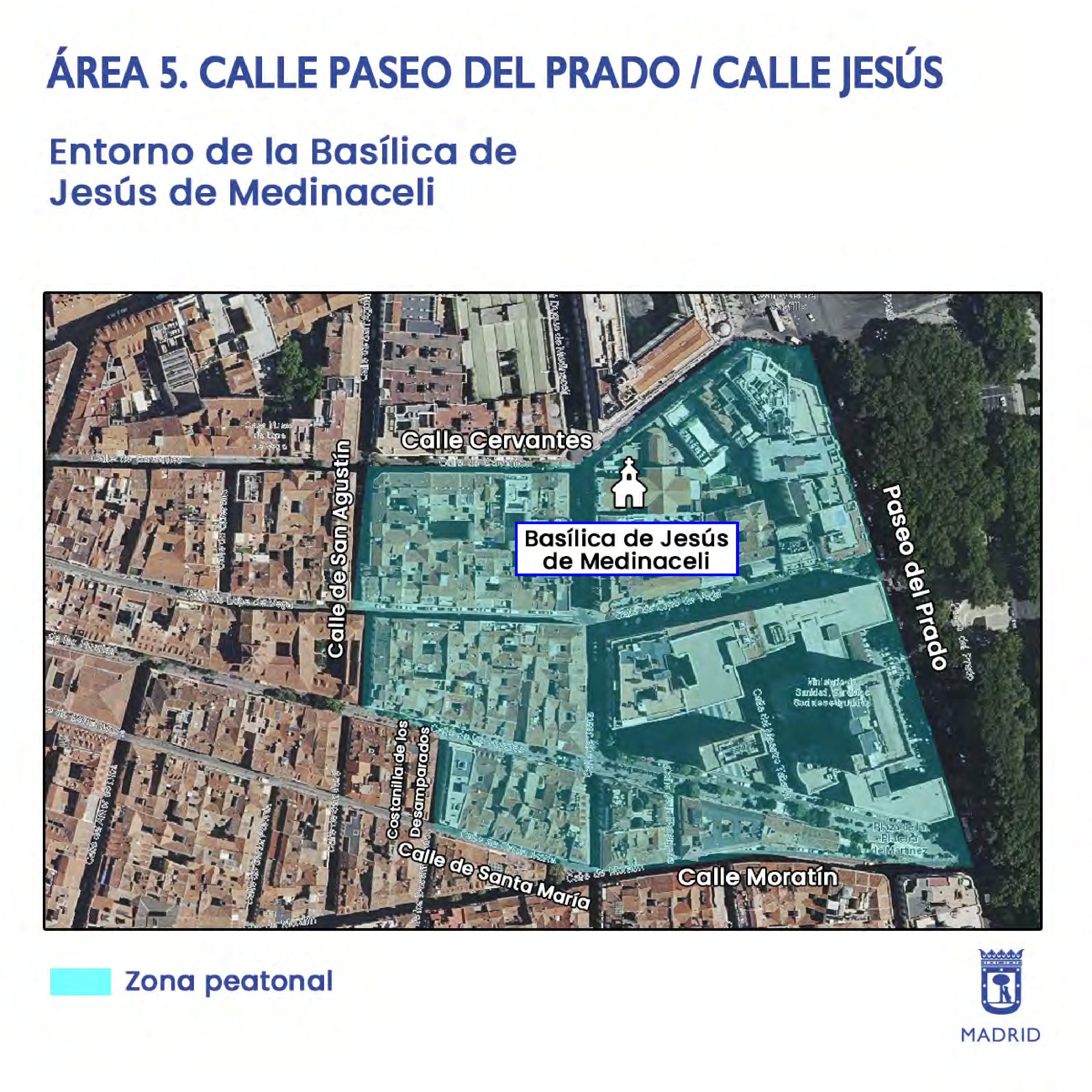 En el entorno de la Basílica de Jesús de Medinaceli se producirán seis cortes para acotar esta área de influencia. Serán en las calles Lope de Vega y paseo del Prado; plaza de la Platería de Martínez (entrada por calle Huertas) y el paseo del Prado; calle Huertas con Costanilla de los Desamparados; calle Jesús con calle de Moratín y calle Lope de Vega con Costanilla de Las Trinitarias. El lugar público afectado será la plaza de Jesús.