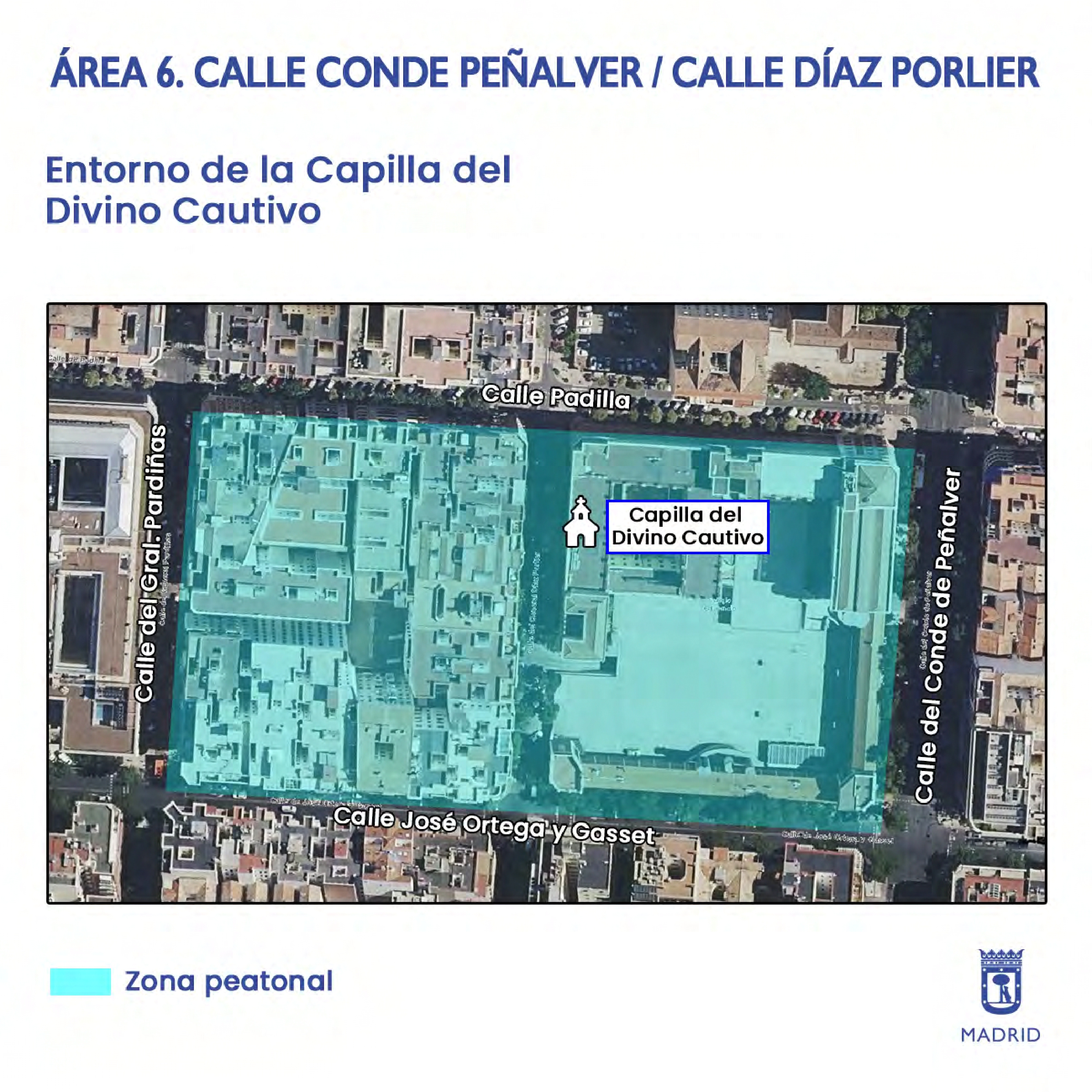 Este perímetro del distrito de Salamanca garantizará la movilidad peatonal en los alrededores de la Capilla del Divino Cautivo Padres Escolapios (calle General Díaz Porlier, 58). Los cortes se producirán solo el día 6, en igual horario de 11:00 a 21:00 h. El perímetro lo conforman las calles Padilla, Conde de Peñalver, calle José Ortega y Gasset y la del General Pardiñas.