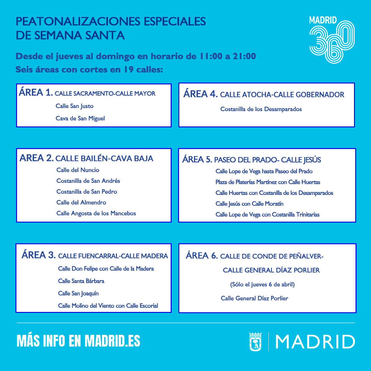 Con el objetivo de garantizar la movilidad peatonal alrededor de las parroquias más emblemáticas de la capital durante esta Semana Santa (desde el Viernes Santo al Domingo de Resurrección), el Área de Medio Ambiente y Movilidad creará, por tercer año consecutivo, seis áreas peatonales en las zonas de influencia más concurridas y que afectarán principalmente al distrito de Centro y al de Salamanca, tal y como ha explicado hoy la portavoz municipal y delegada de Seguridad y Emergencias, Inmaculada Sanz.