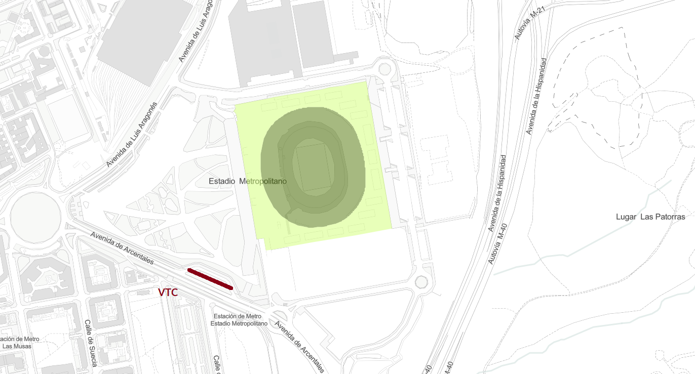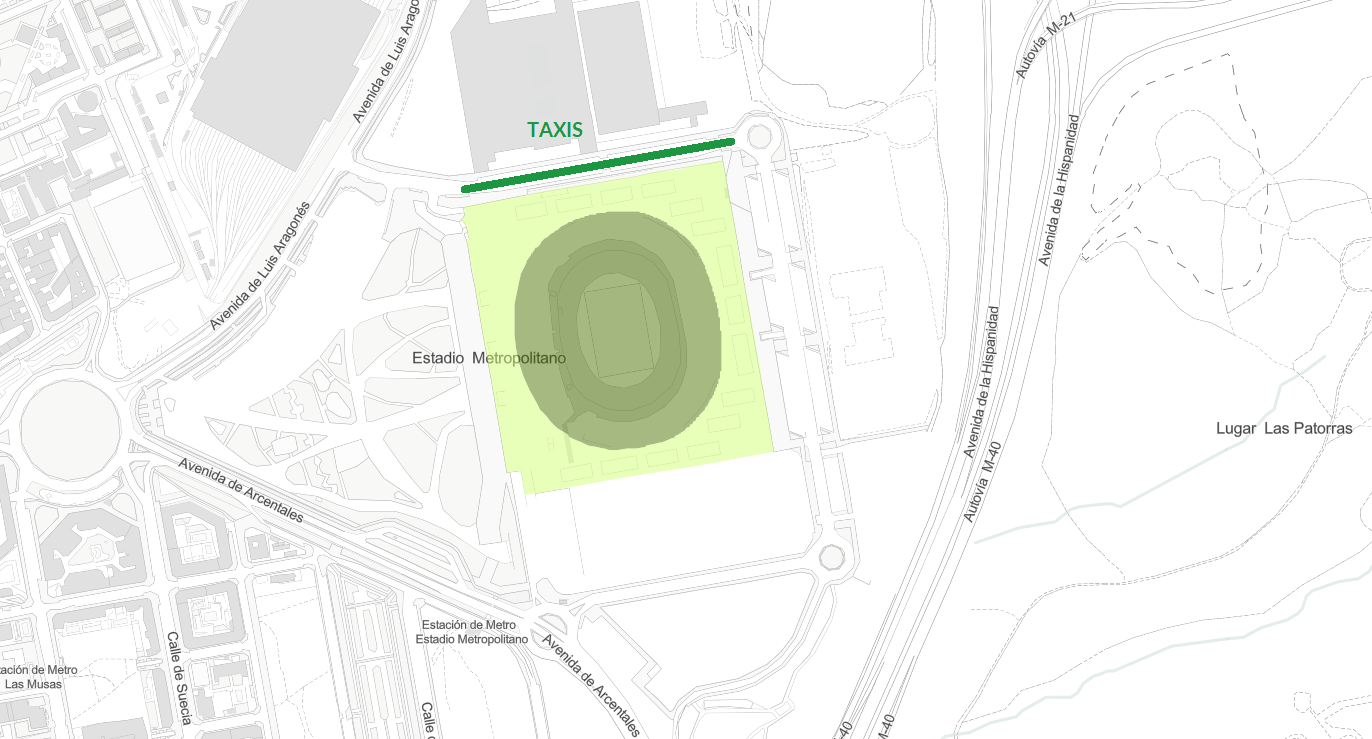 Se establecerá como zona de parada de taxis durante los conciertos el vial perimetral al norte del estadio (consultar plano). A esta zona se podrá acceder desde la M40 por la avenida de Arcentales, sin llegar a la Glorieta de Arcentales.