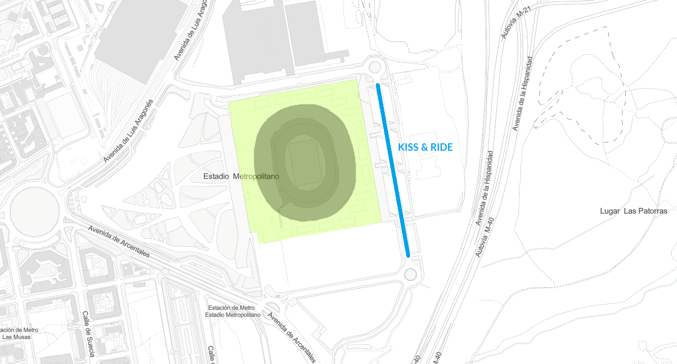 Se habilitará una zona para facilitar la subida y bajada de asistentes en el vial este del estadio (consultar plano) a la que se podrá acceder a través del vial norte del estadio Riyadh Air Metropolitano desde la avenida de Luís Aragonés, únicamente en ese sentido de circulación.
