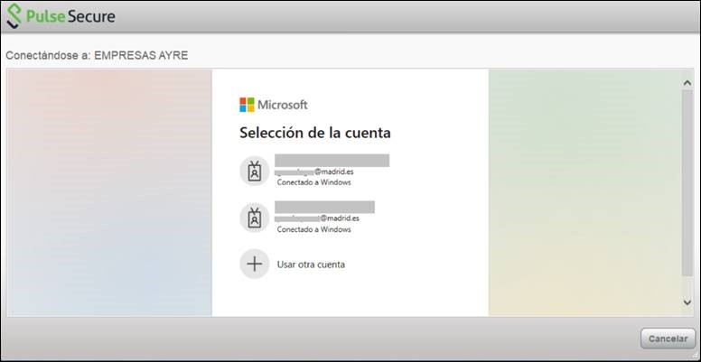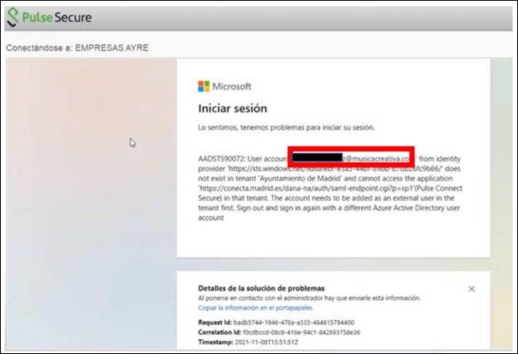 Si a pesar de seguir las instrucciones indicadas no puede acceder al pulsar “Conectar” en la aplicación de Pulse, es posible que esté utilizando el usuario/contraseña de otra cuenta office, como podría ser la de su organización. Esto lo puede detectar si obtiene un error como el de la figura, en el que la cuenta indicada no es xxx@madrid.es