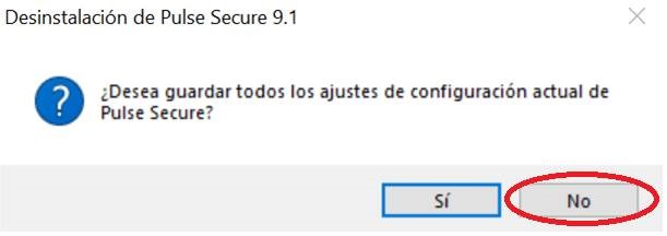 MUY IMPORTANTE: Al desinstalar Pulse Secure pregunta “¿Desea guardar todos los ajustes de configuración actual de Pulse Secure?” DEBE INDICAR “NO”.
