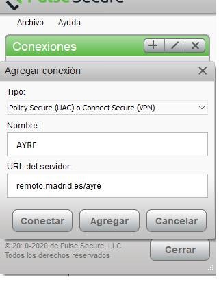 - Cree la conexión AYRE (ver el manual a pie de página) e indique en URL: https://remoto.madrid.es.
