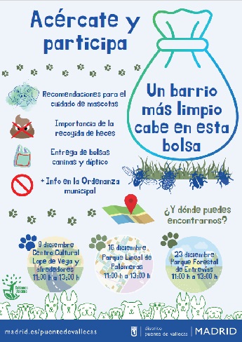 Desde la Junta Municipal del Distrito Puente de Vallecas, el programa Cuidamos Vallecas continua con la campaña de recogida de heces caninas ‘Un barrio más limpio cabe en esta bolsa’