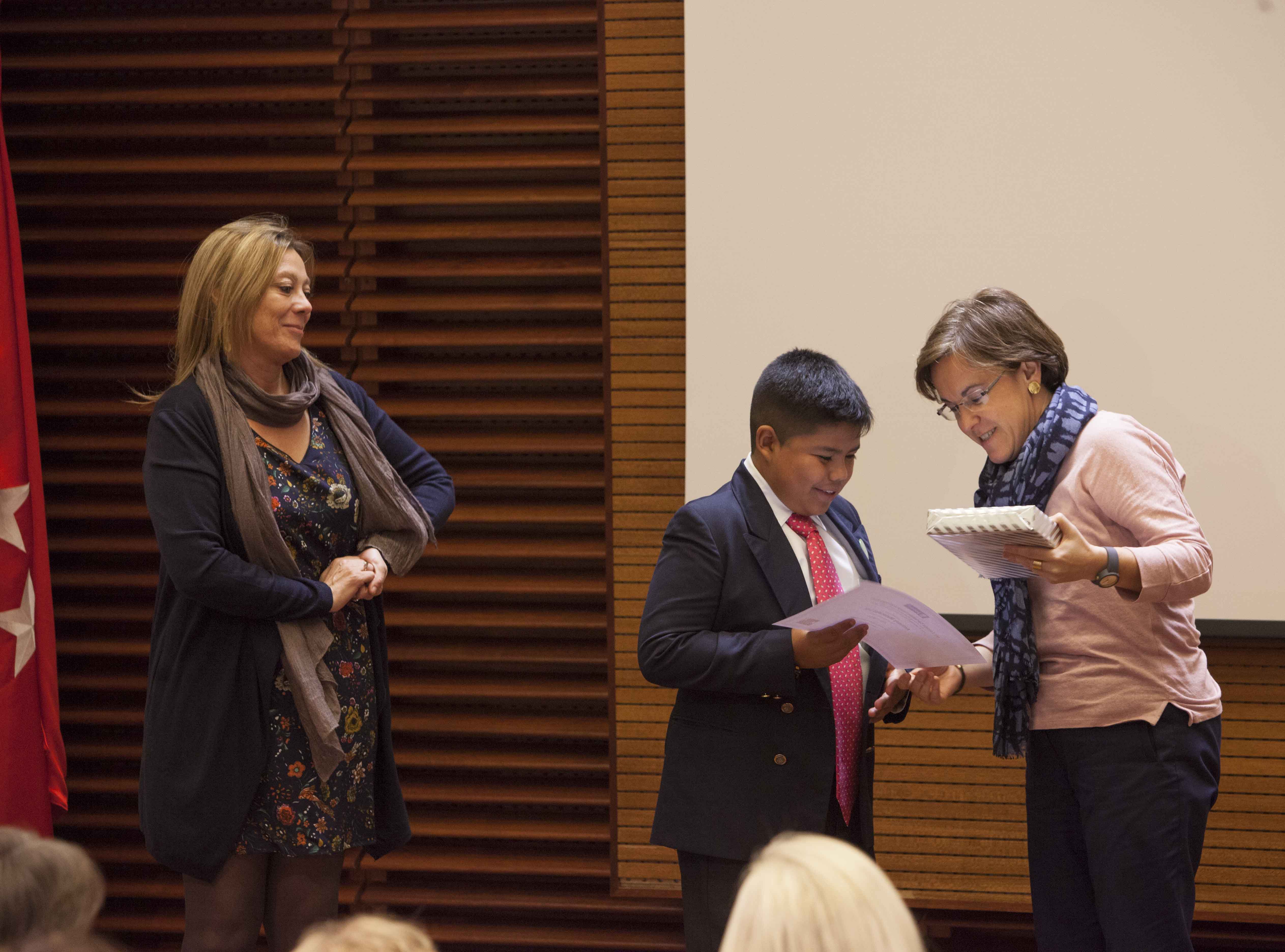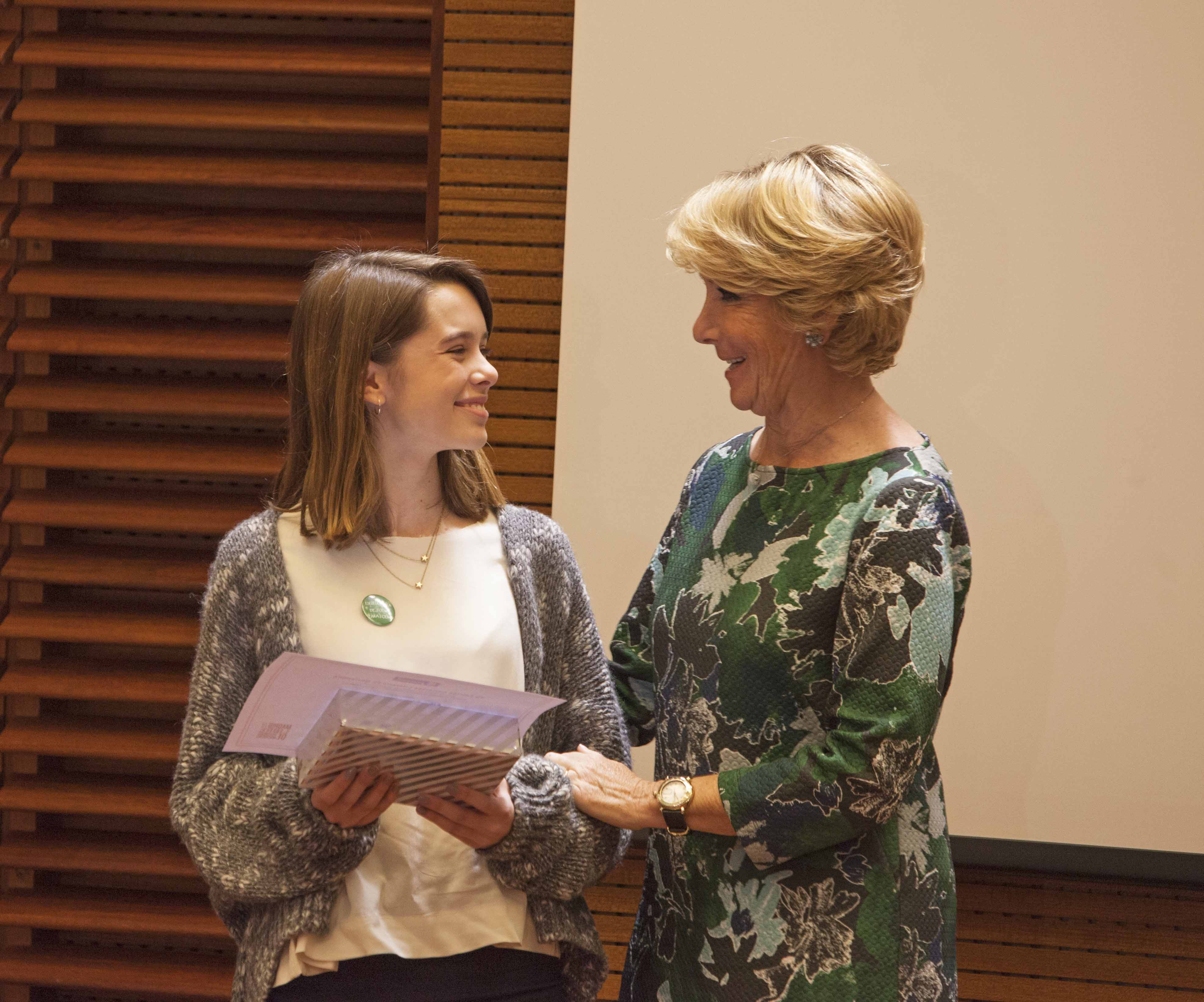 Las portavoces de los Grupos Municipales del PP, Esperanza Aguirre, del PSOE, Purificación Causapié, y de Ciudadanos, Begoña Villacís, han sido las encargadas de entregar los premios y galardones del VII Certamen Literario 25 de Noviembre, en el que han participado los alumnos de 3º y 4º de Educación Secundaria Obligatoria (ESO) y Bachillerato de todos los Centros de Enseñanza Secundaria de la ciudad de Madrid.