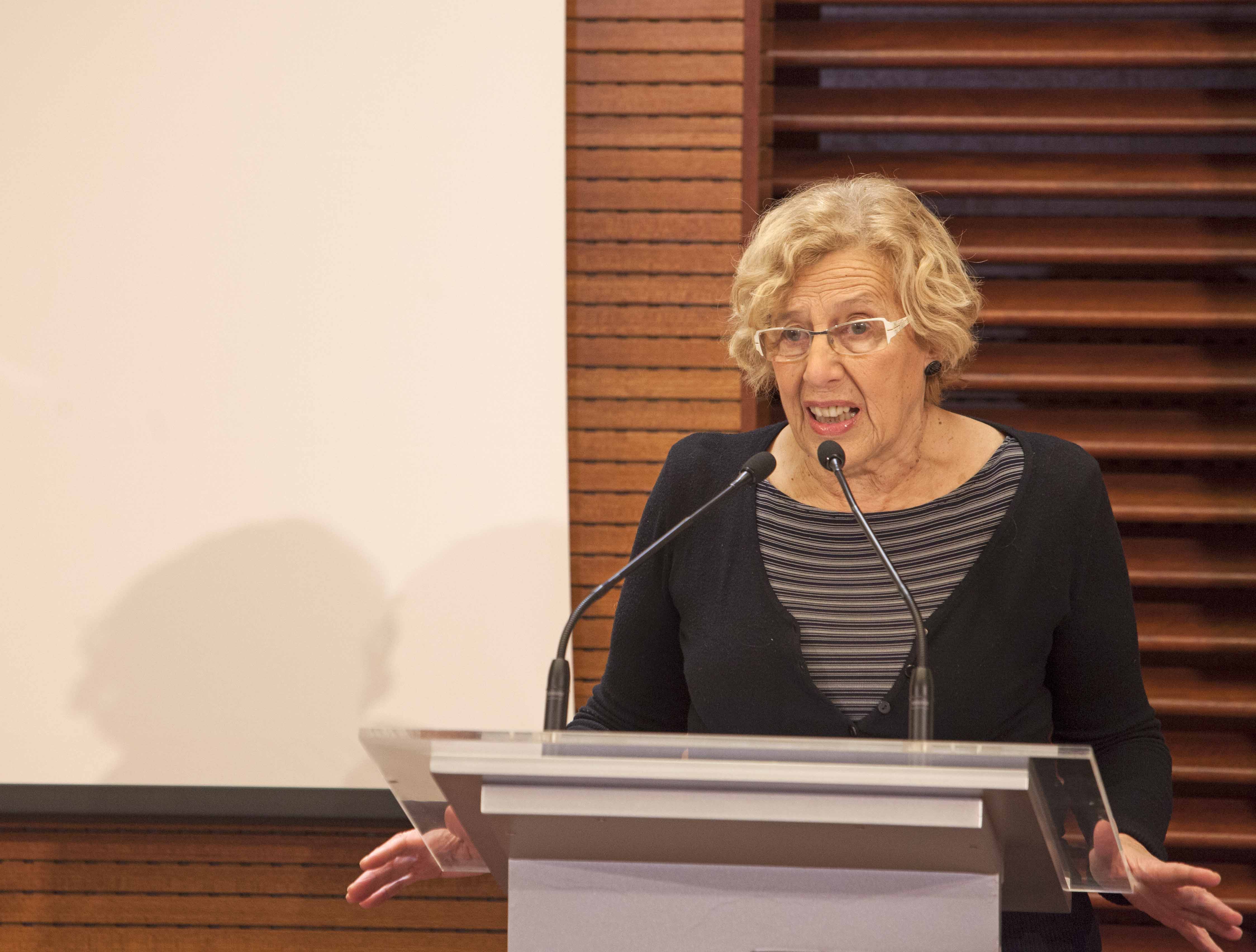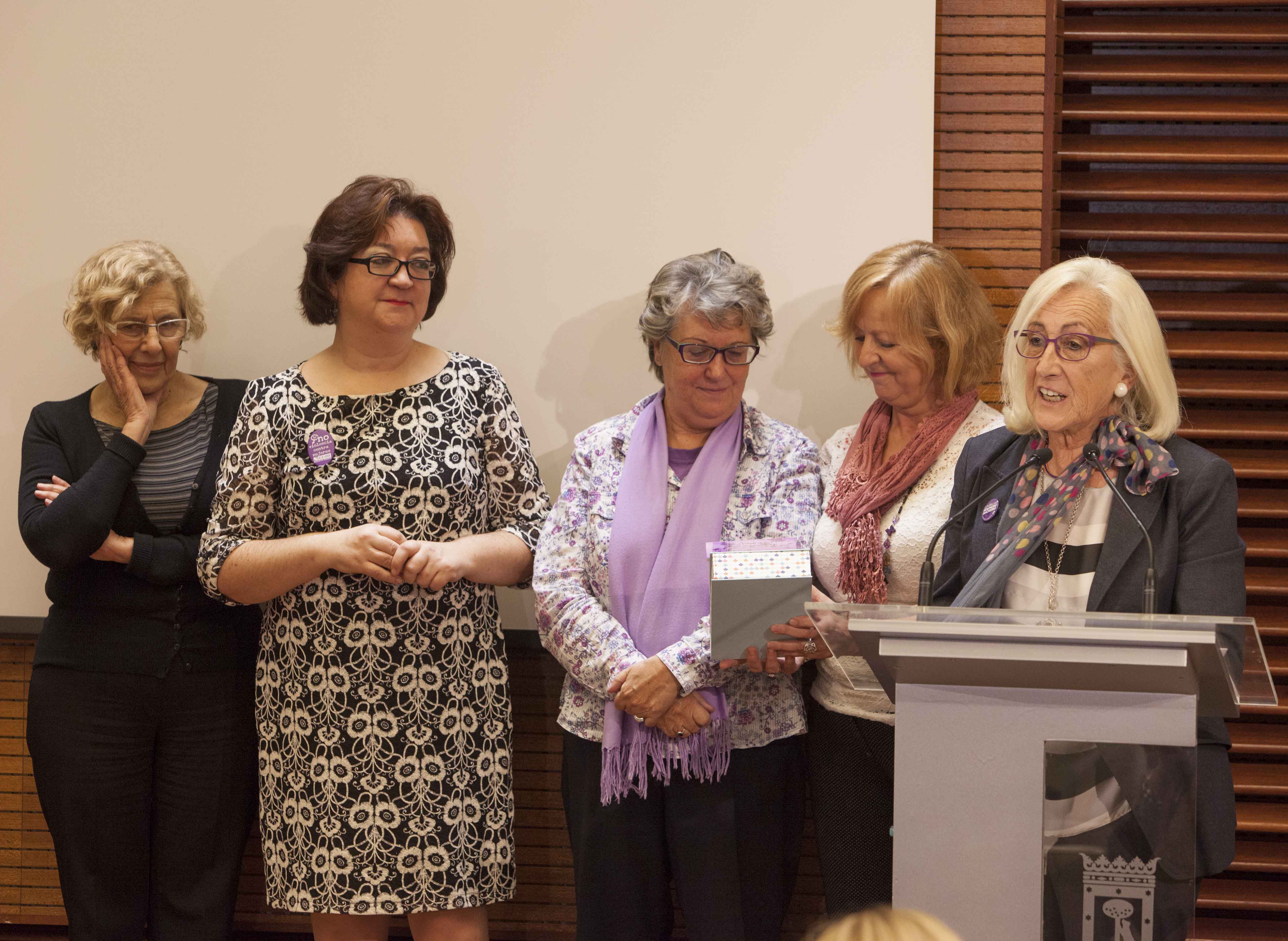 "Gracias por demostrarnos que la manera de conseguir acabar con esta violencia que nos duele tanto es trabajar todos juntos", ha hecho hincapié Manuela Carmena, alcaldesa de Madrid, tras entregar el reconocimiento "25 de noviembre" al Foro de Madrid Contra la Violencia hacia las Mujeres por su trayectoria de denuncia y sensibilización social contra la violencia de género, en el acto institucional que se ha celebrado hoy (lunes, 30 de noviembre) en el Palacio de Cibeles como colofón a la campaña con el lema por un Madrid Libre de Violencias Machistas que ha llevado a cabo la Dirección de Igualdad del Área de Equidad, Derechos Sociales y Empleo.