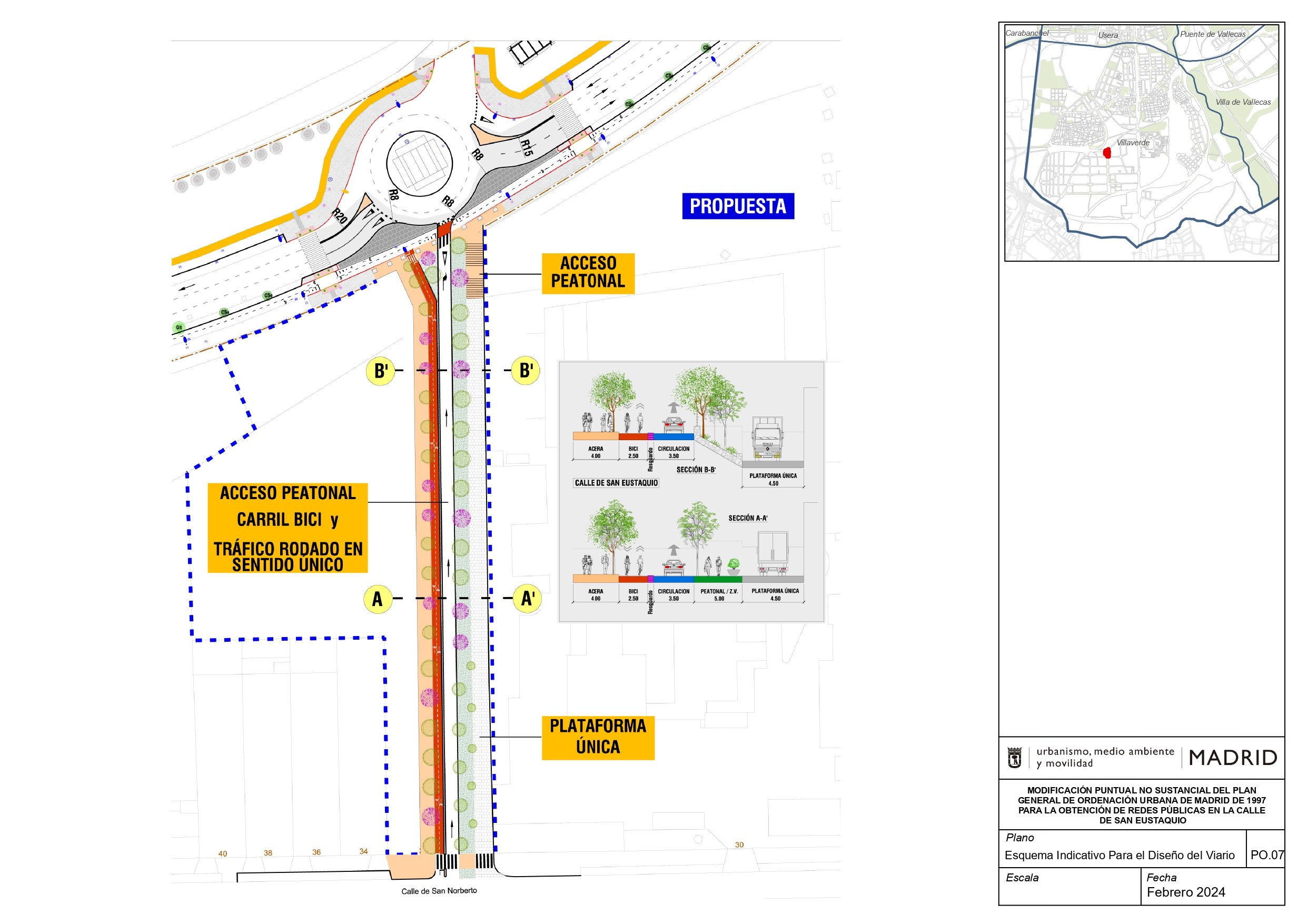La modificación del PGOUM pretende la transformación del tramo norte de la calle de San Eustaquio para conectarlo con la Gran Vía de Villaverde, salvando la actual diferencia de cota derivada de la presencia del ferrocarril bajo la avenida, lo que requerirá la obtención de suelo para la ampliación de la red pública. Asimismo, se aumentará la anchura de dicho viario y se contemplarán nuevas conexiones peatonales y rodadas entre ambas calles.