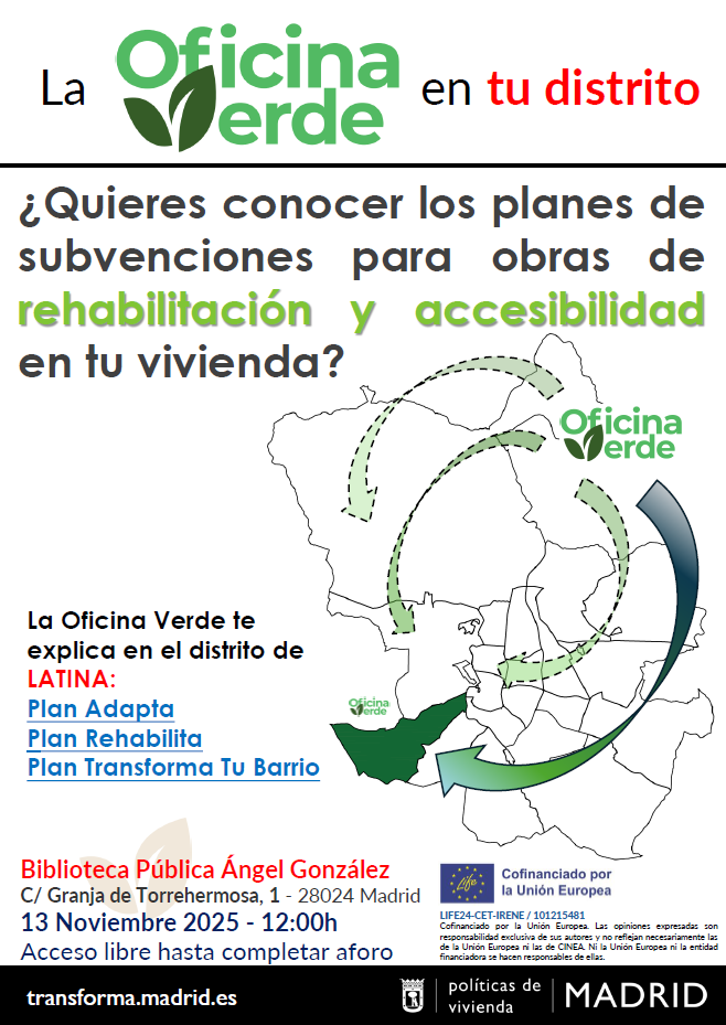 2025.11.13_Jornada "La Oficina Verde en tu Distrito" en el Distrito de LatinaSi quieres conocer los planes de subvenciones para obras de rehabilitación y accesibilidad en tu vivienda, le informamos que la Oficina Verde realiza Jornadas Informativas en los distritos sobre los Planes Adapta, Rehabilita y Transforma tu Barrio. -